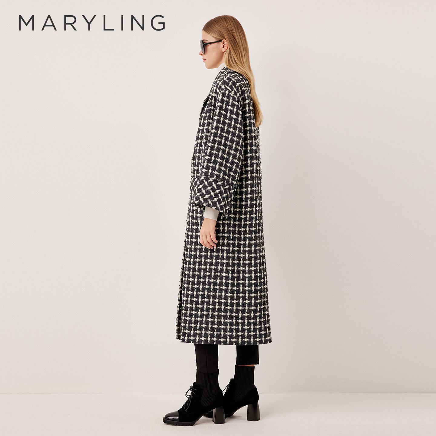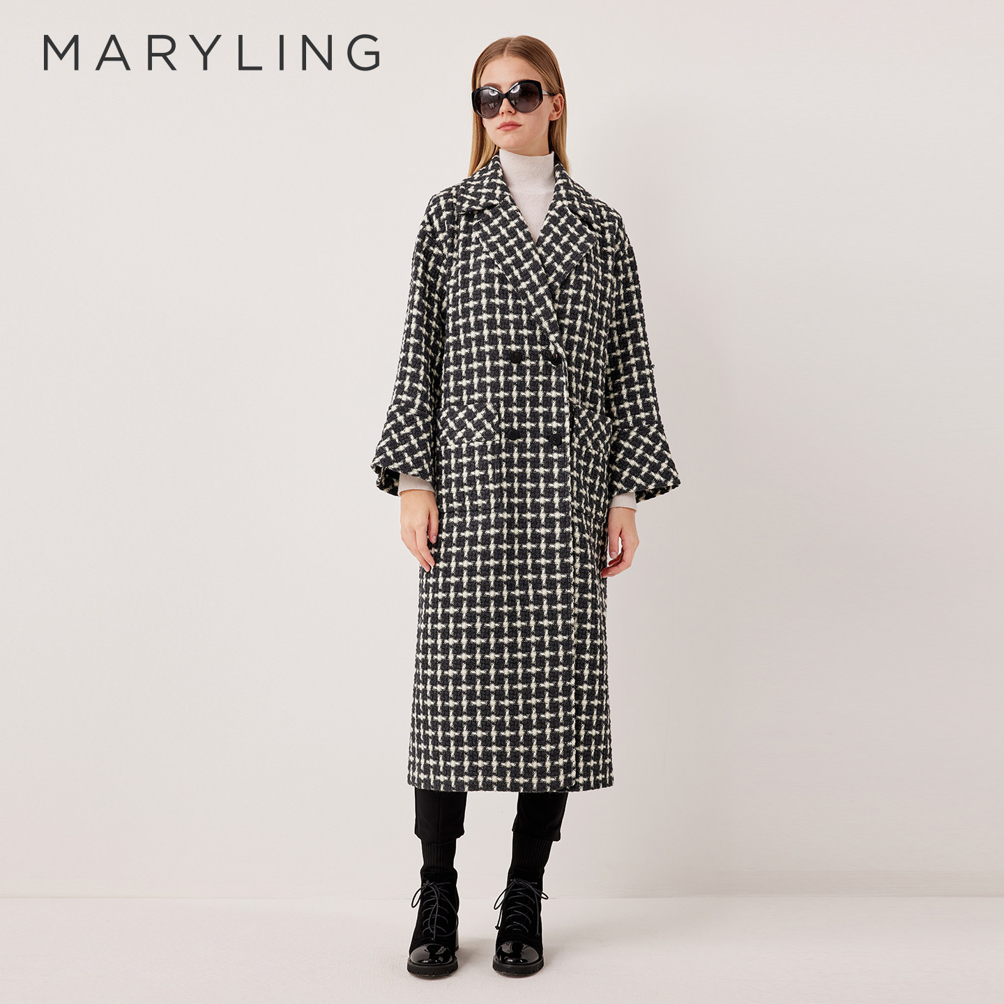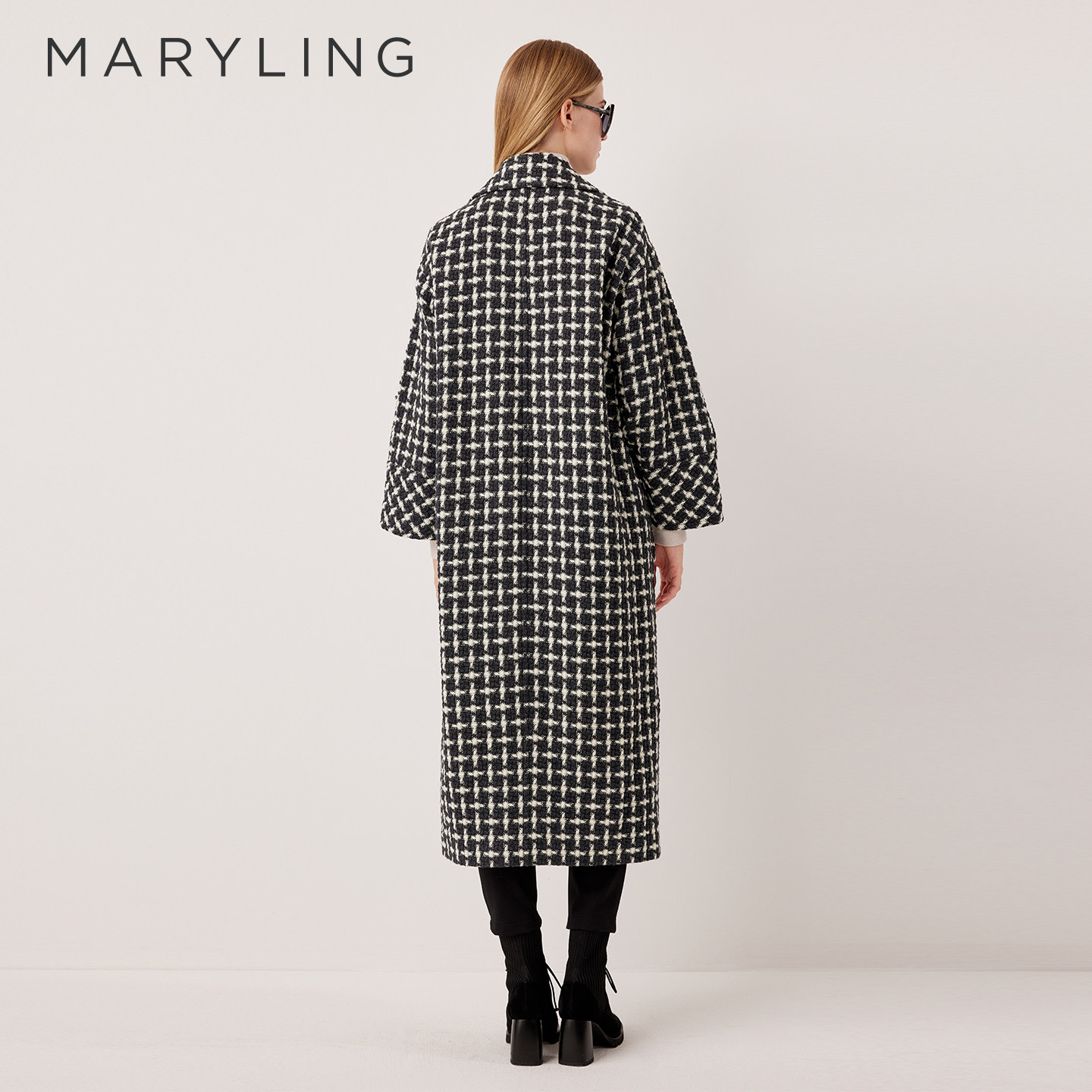 MARYLING玛俪琳2025秋冬新品黑白千鸟格翻领长款大衣A1FHW93340