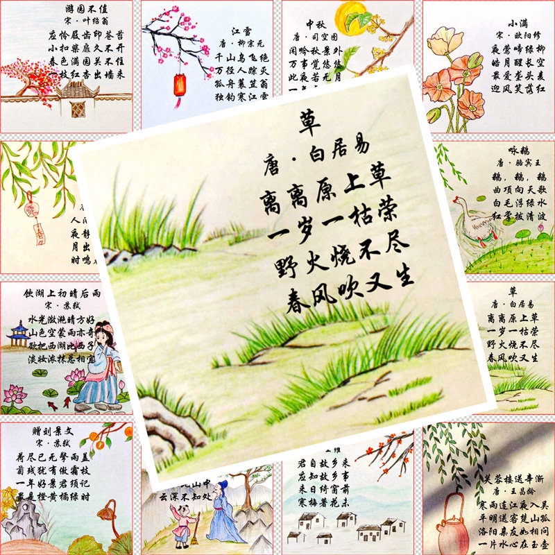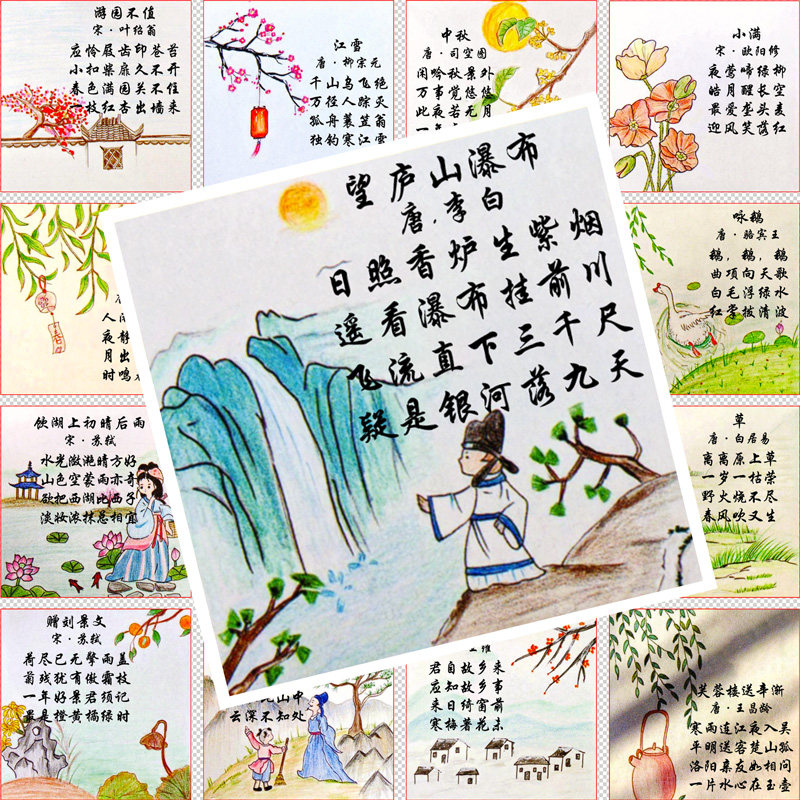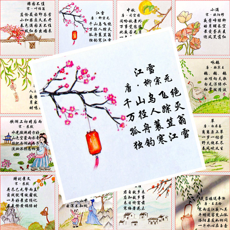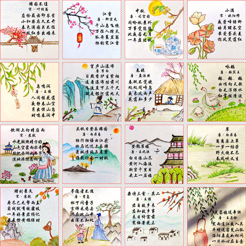 48张古诗配画贴纸学生学习贴画diy装饰小图案手账手机电脑