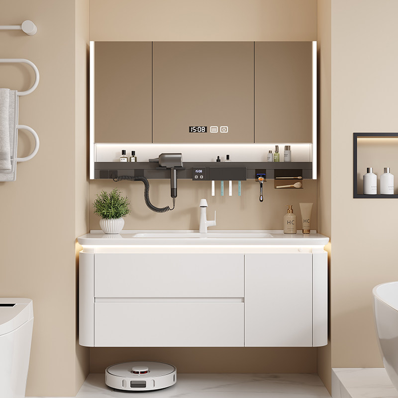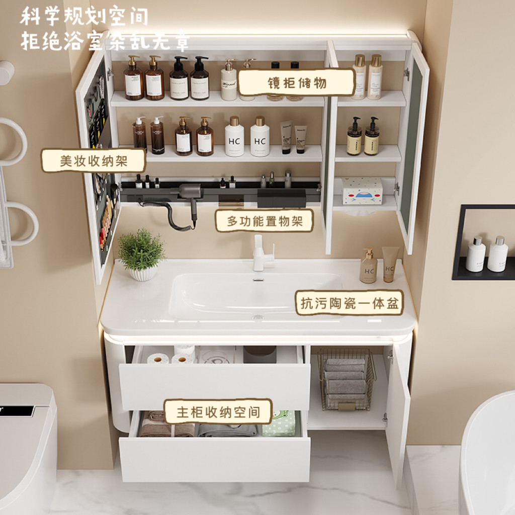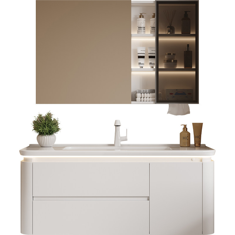 法式奶油风陶瓷一体盆智能收纳架镜柜组合卫生间收纳洗漱台洗脸盆