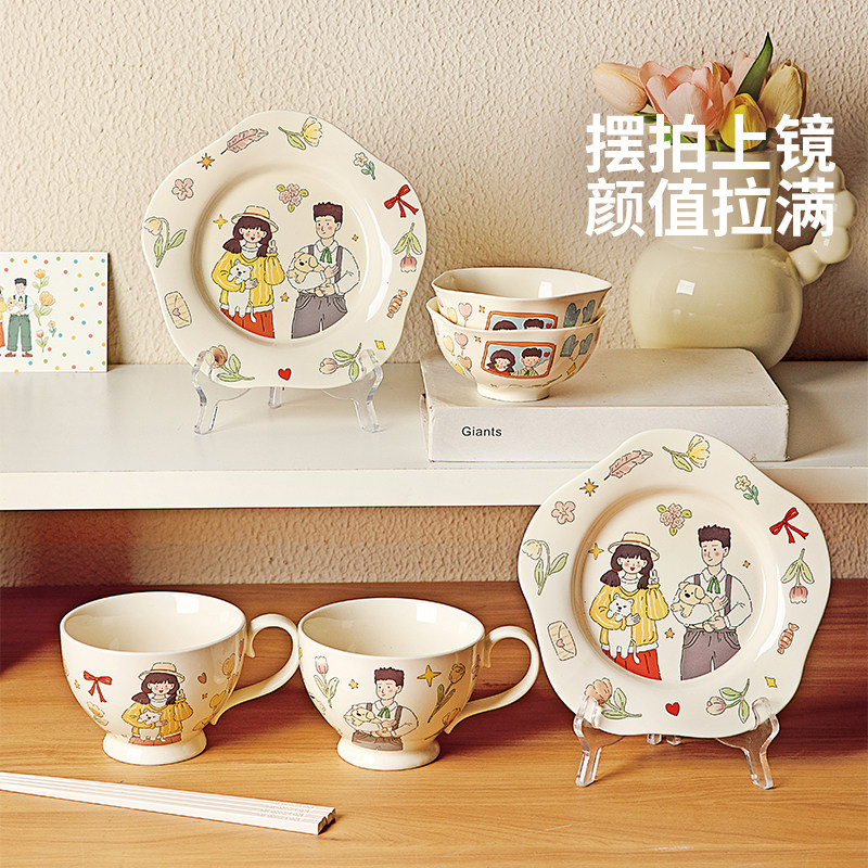 奶油风陶瓷碗家用卡通菜盘子可爱米饭碗汤碗釉下彩儿童餐具耐高温