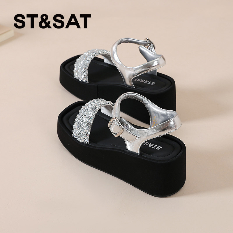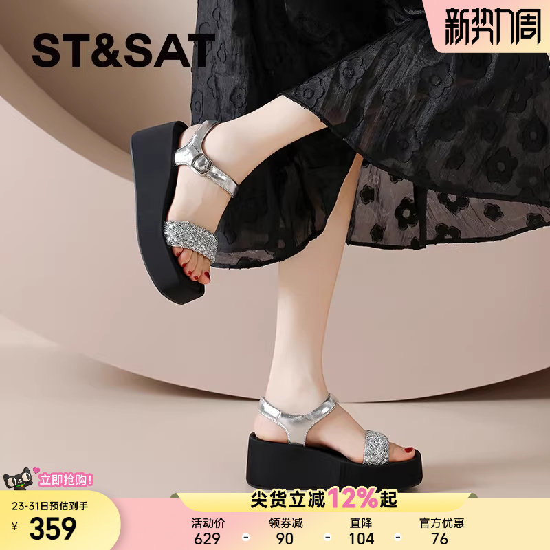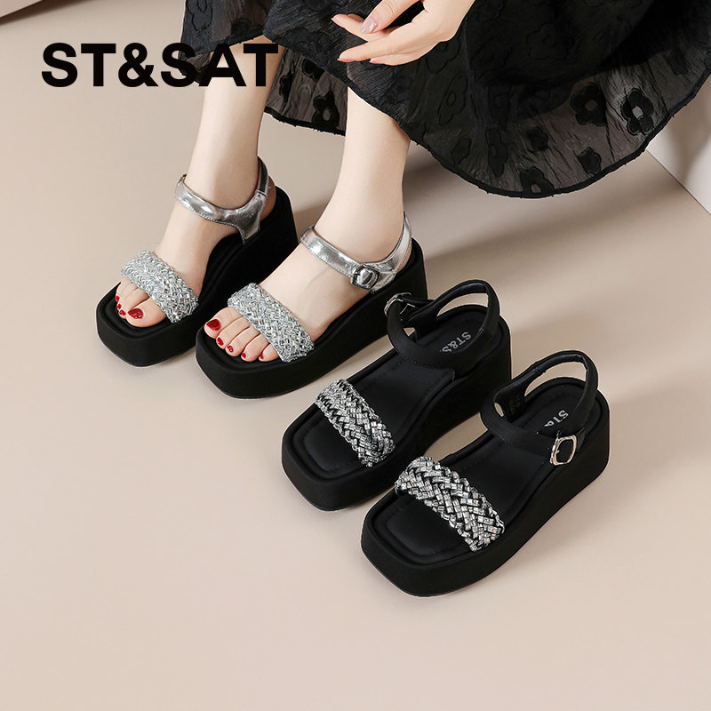 星期六时尚坡跟凉鞋女鞋夏季新款百搭水钻厚底沙滩鞋凉拖露趾时髦