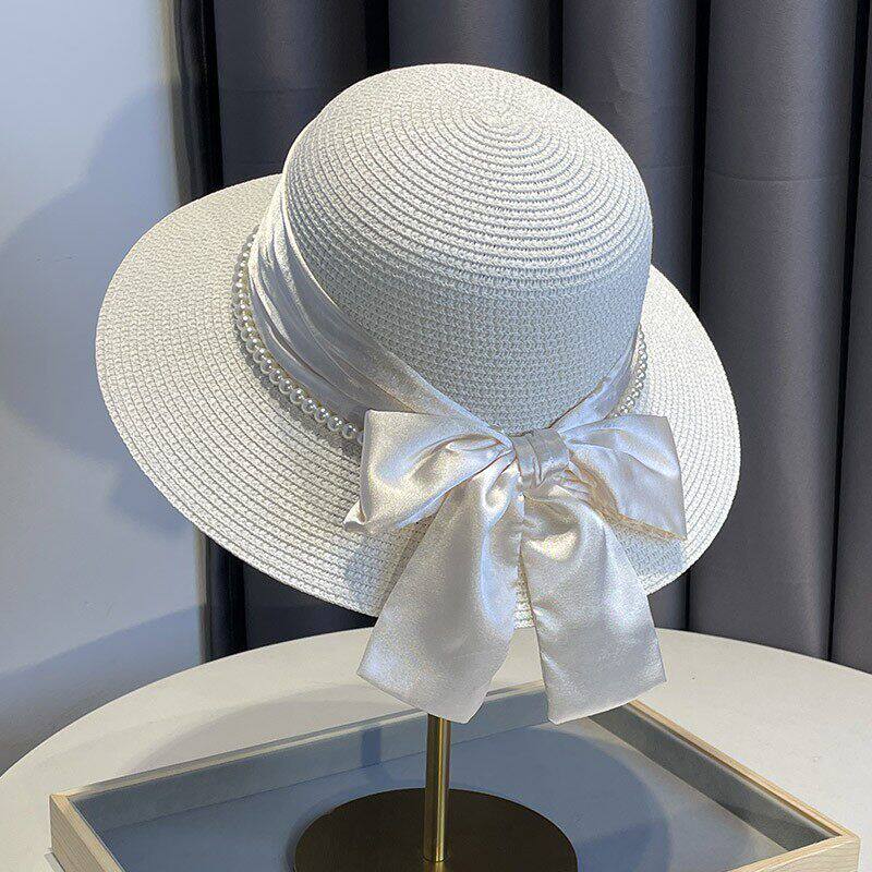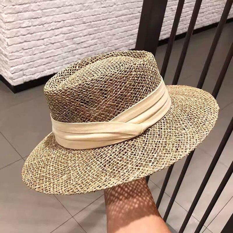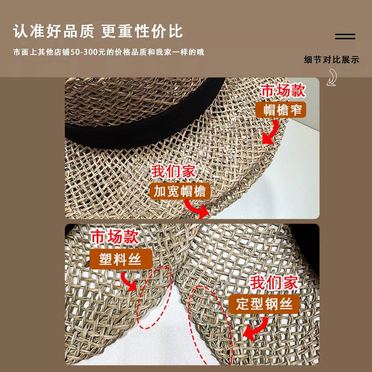 草编网红平顶帽子女款草帽夏季礼帽英伦海边度假防晒帽镂空遮阳帽