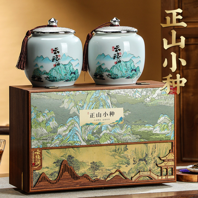 2025新茶特级正山小种浓香型红茶叶年货送礼木纹陶瓷罐礼盒装500g