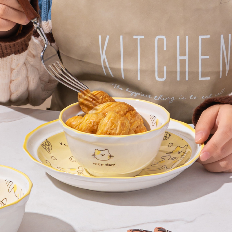 奶油风陶瓷碗家用卡通菜盘子可爱米饭碗汤碗釉下彩儿童餐具耐高温