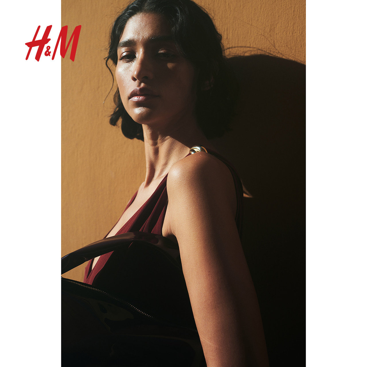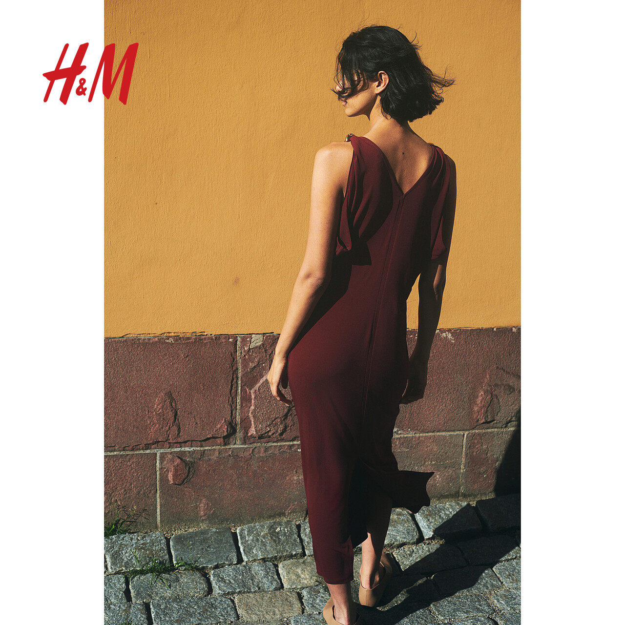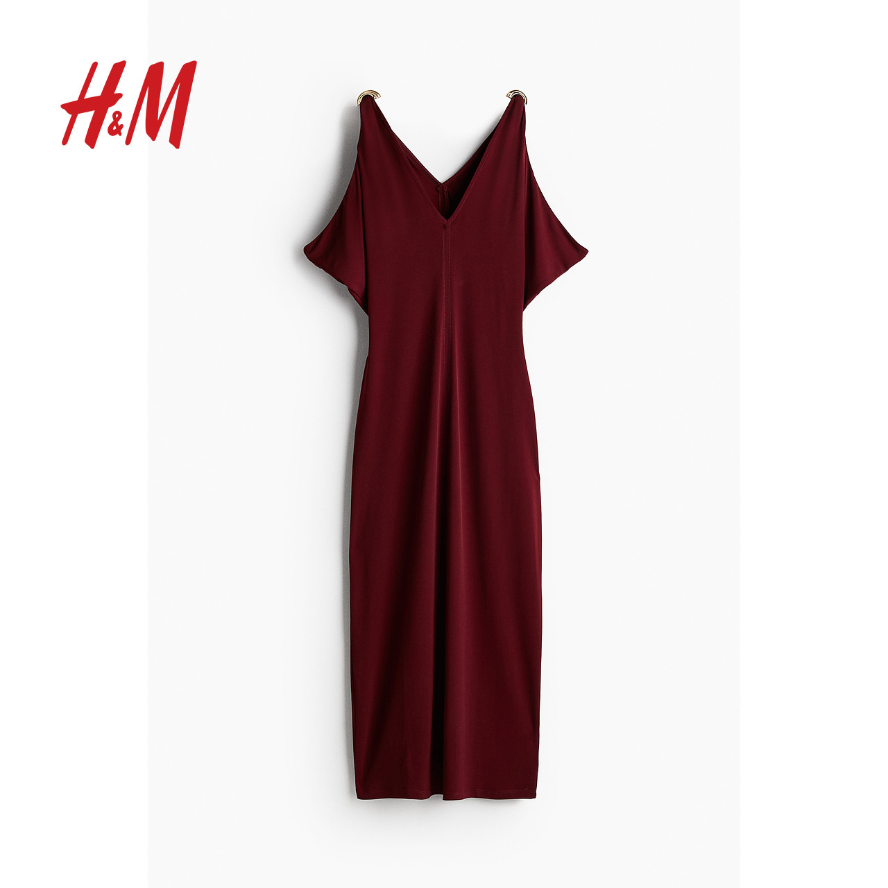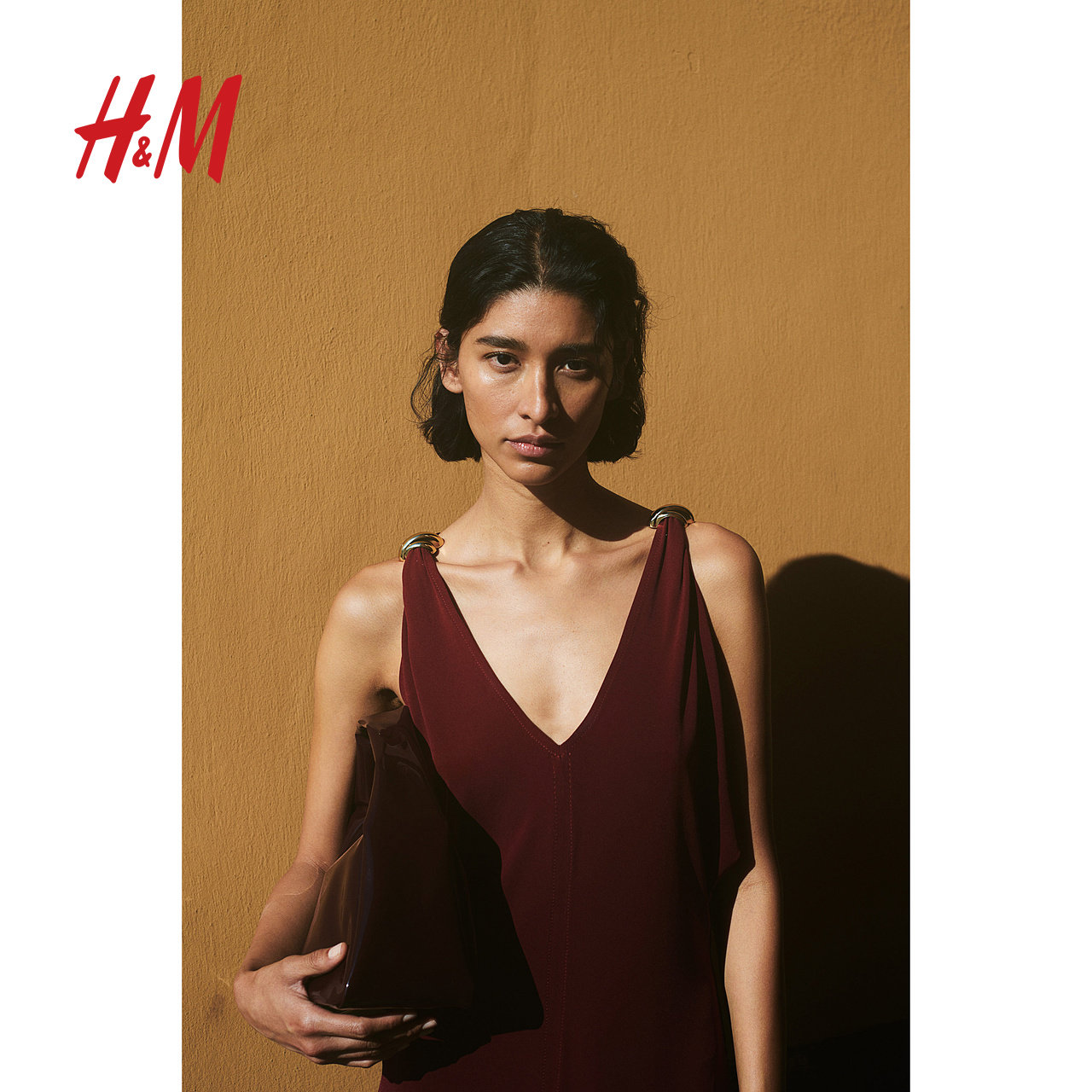 【致臻系列】HM女装红色连衣裙冬季V领垂感长裙1254583