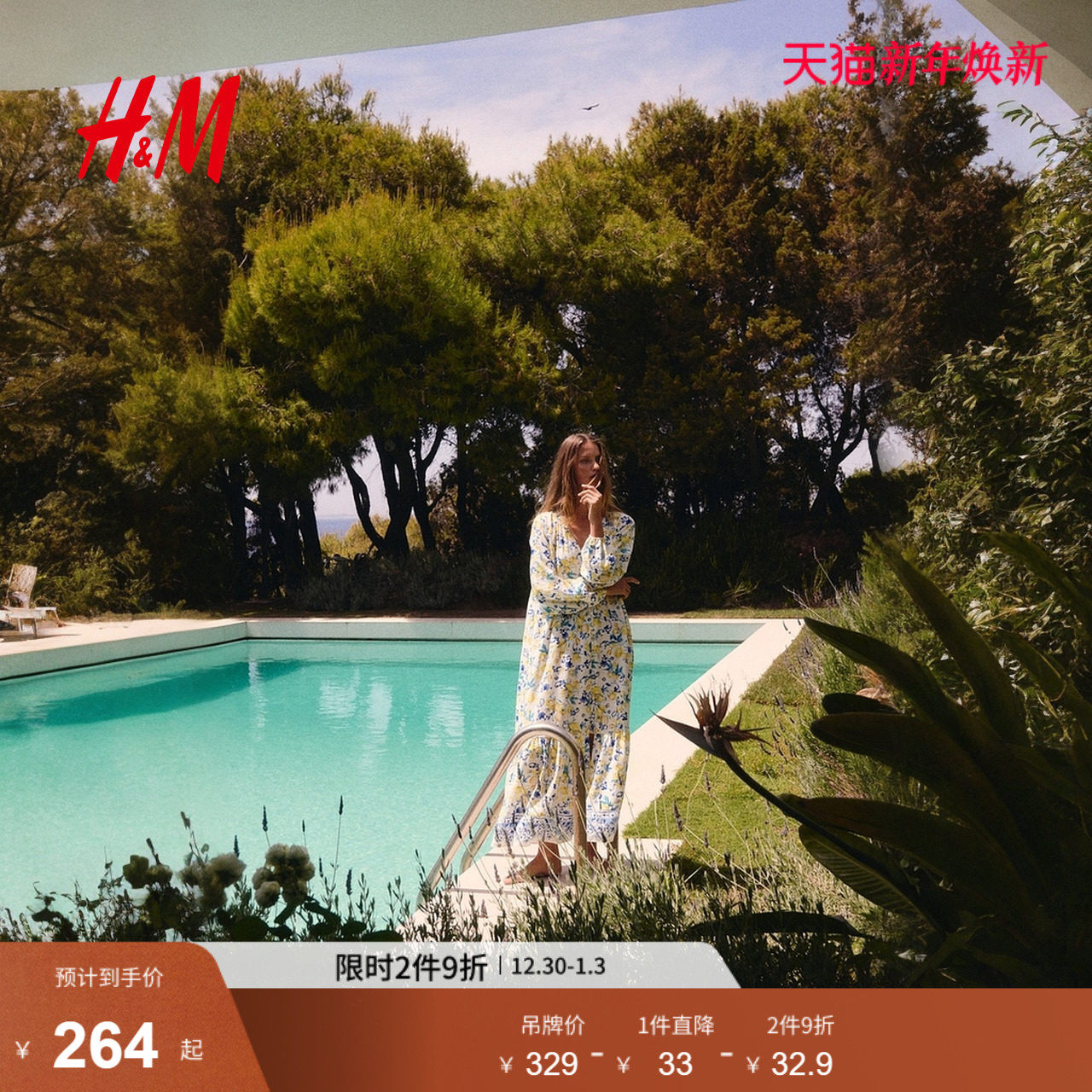 HM女装连衣裙冬季腰部系带绉织灯笼花卉印花长裙1226566