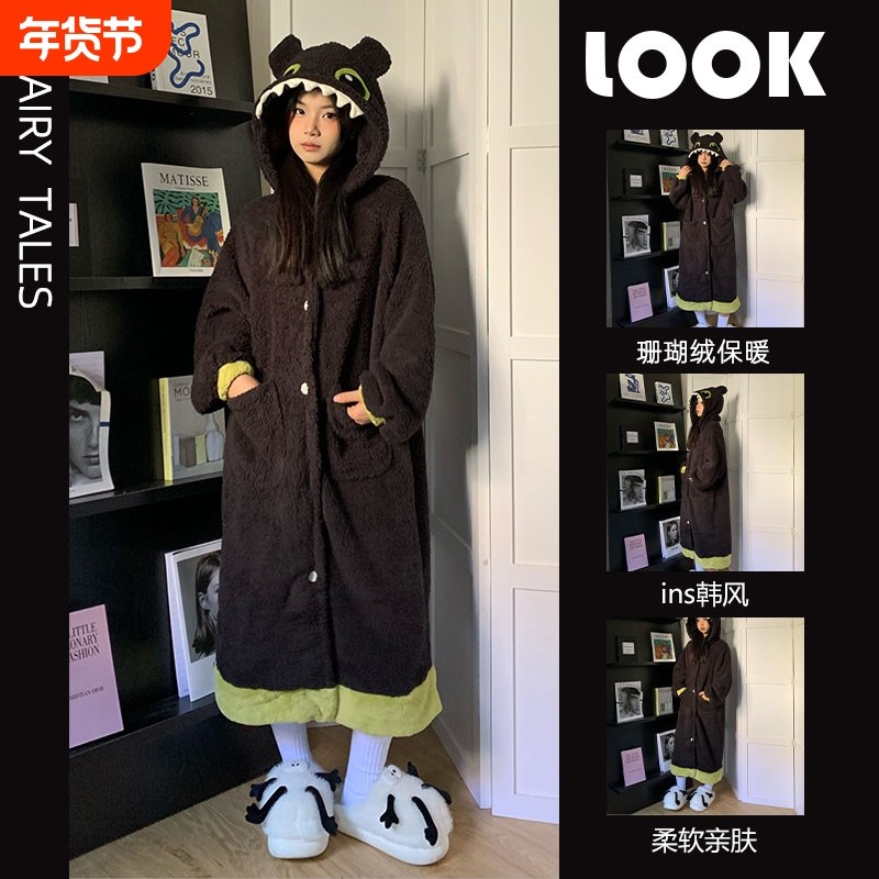 无牙仔睡袍珊瑚绒睡衣女秋冬款2025新款冬季加厚长睡裙连帽家居服