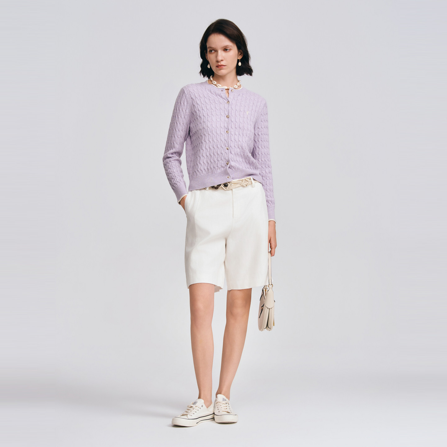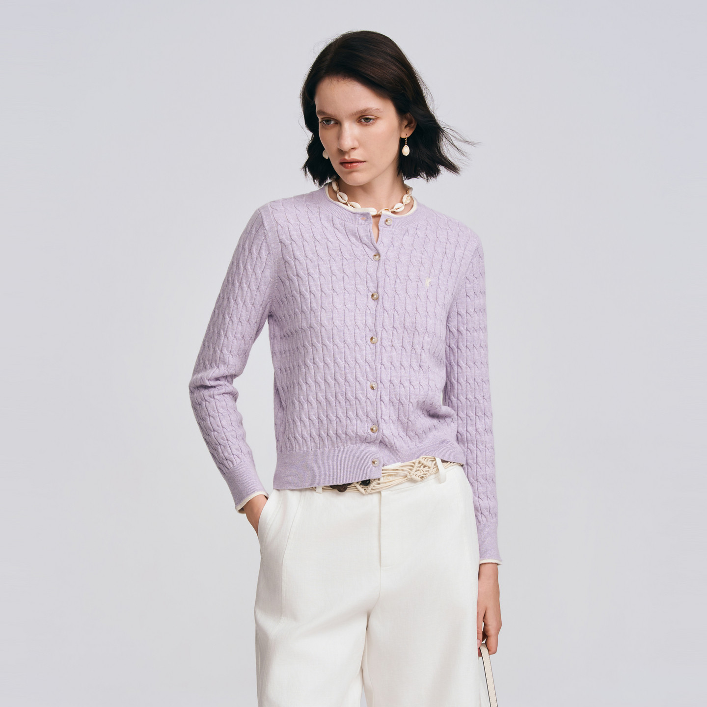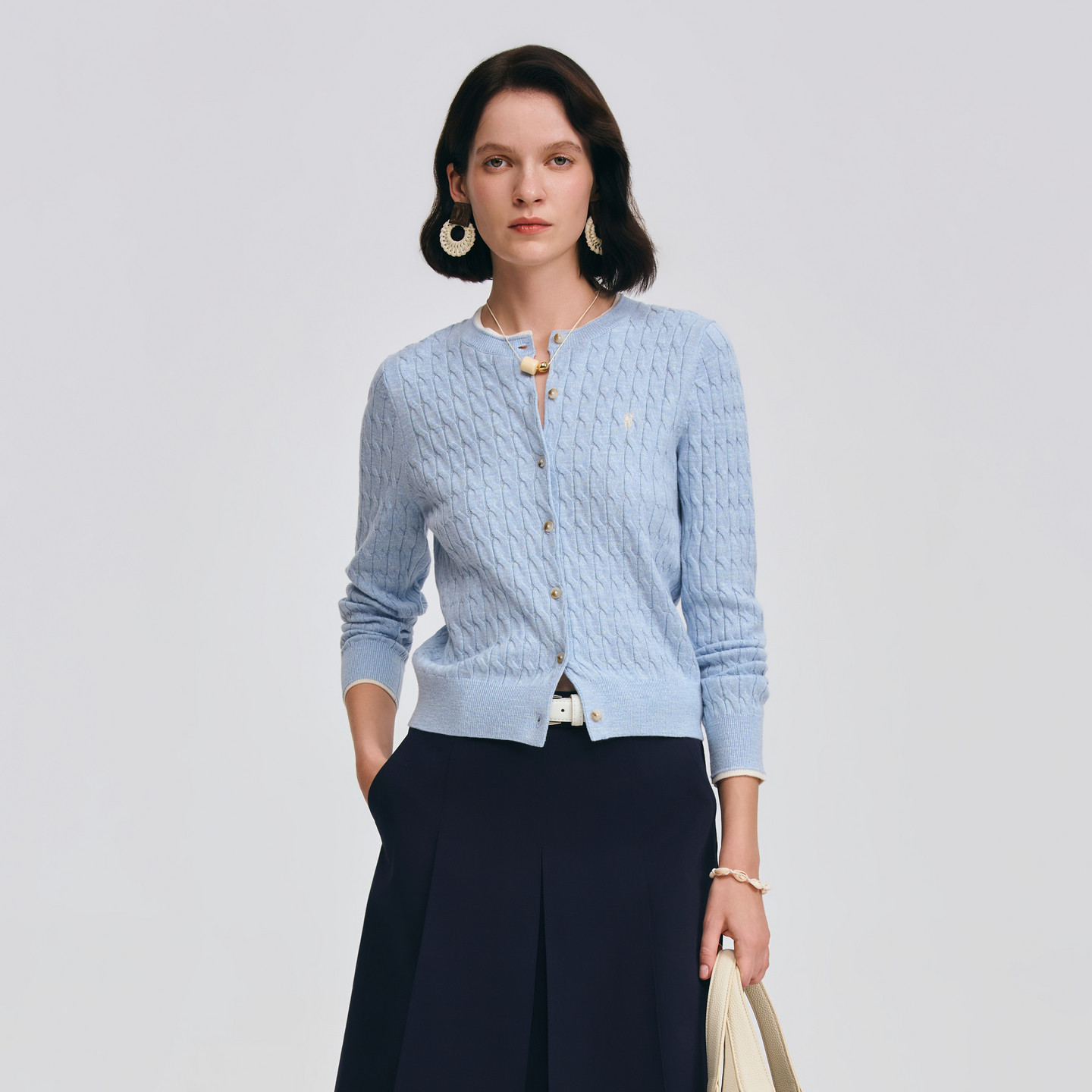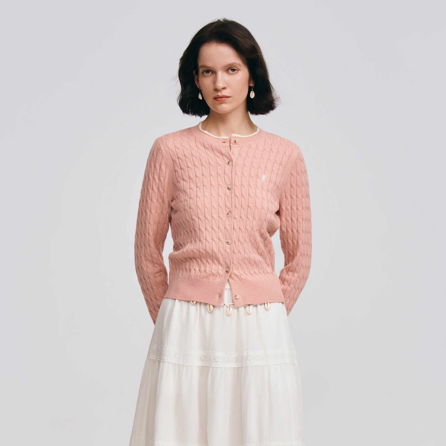 POLOWALK女士长袖针织衫2026春季新款圆领绞花修身针织开衫毛衣女