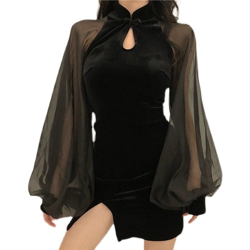 修身显瘦立领金丝绒连衣裙春秋水滴镂空灯笼袖不对称开叉包臀裙
