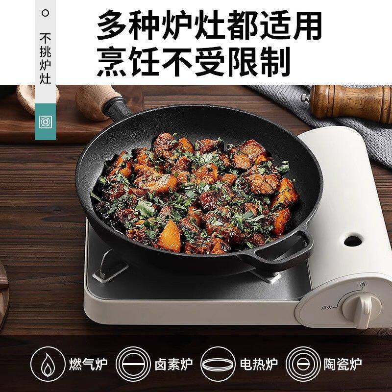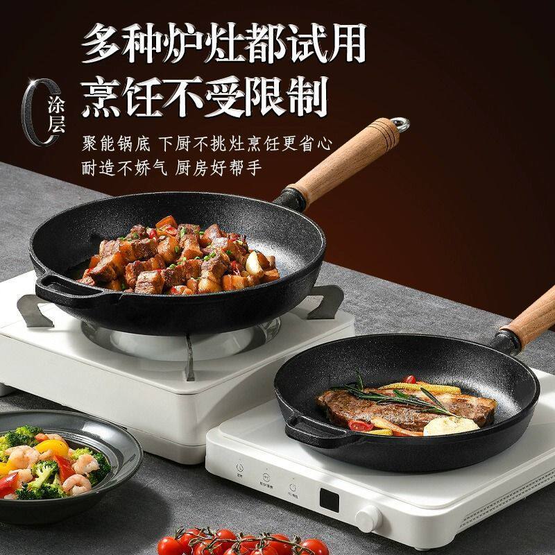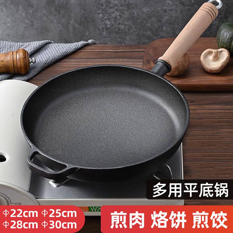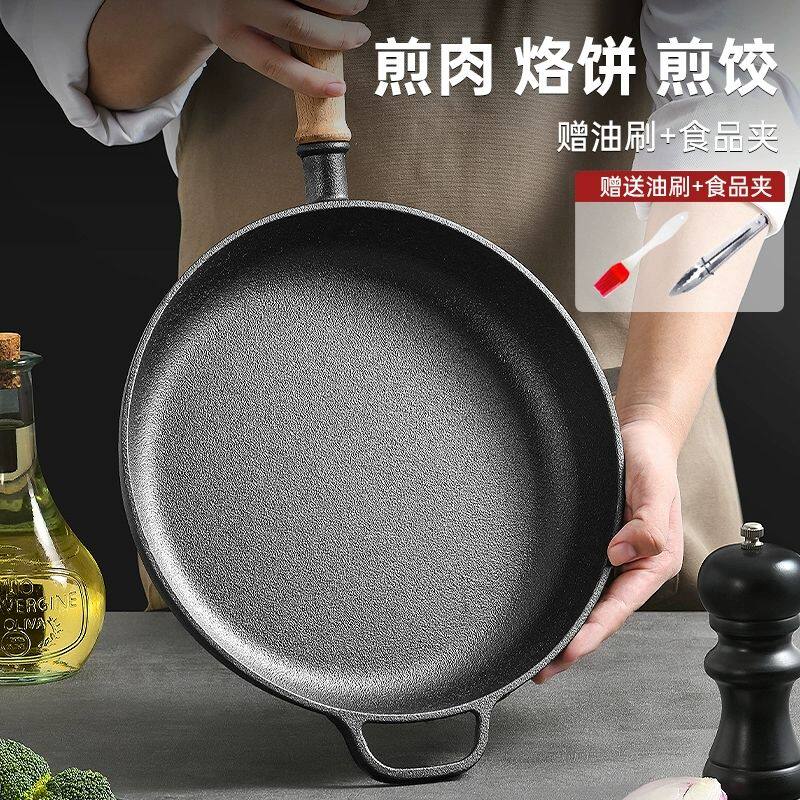 铸铁平底锅无涂层牛排煎锅烙饼锅燃气灶适用加厚铁锅老式煎饼锅
