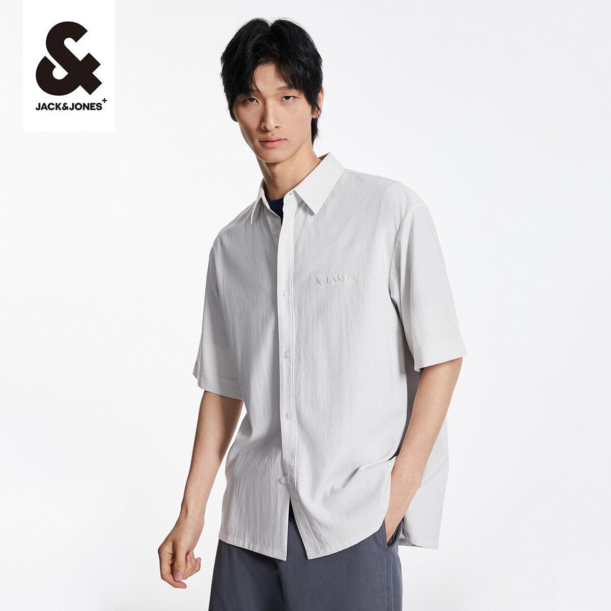 杰克琼斯夏季青春宽松翻领双层字母刺绣撞色休闲短袖衬衫上衣男装