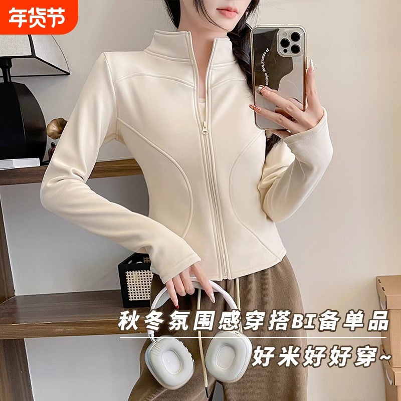 速干显瘦瑜伽服外套女跑步运动上衣加绒骑行服紧身健身服加厚秋冬