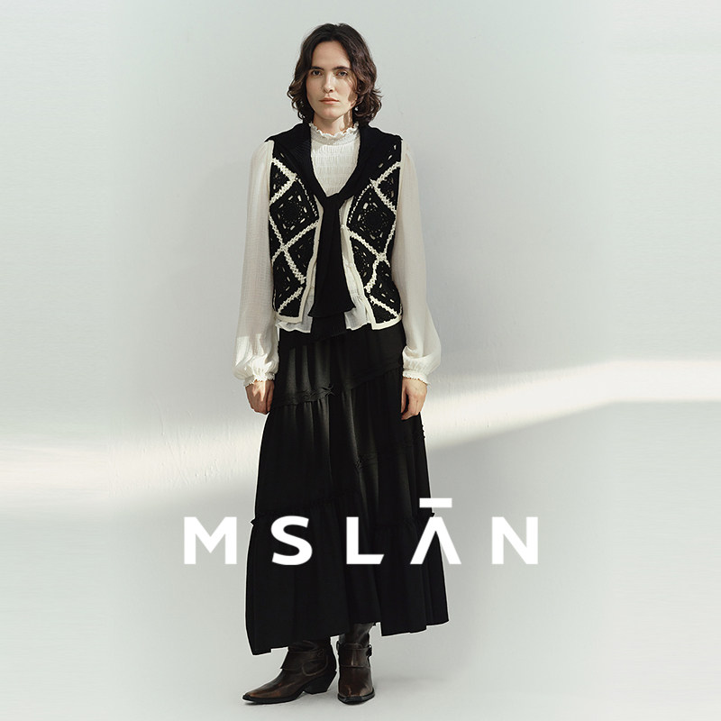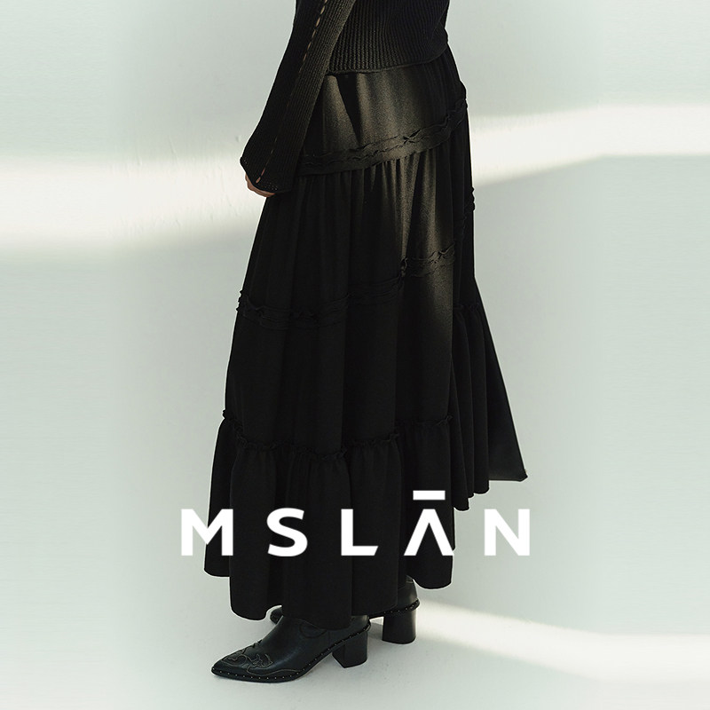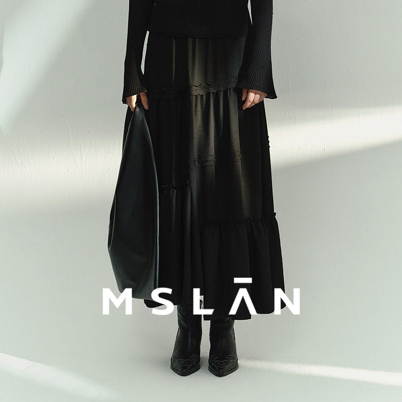 MSLAN26春冬复古垂感重工木耳边不规则分割显瘦黑色半身裙MHAQ155