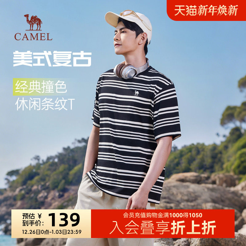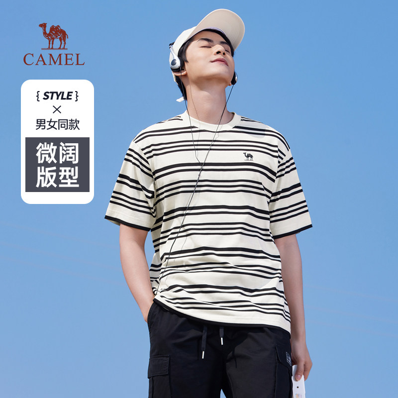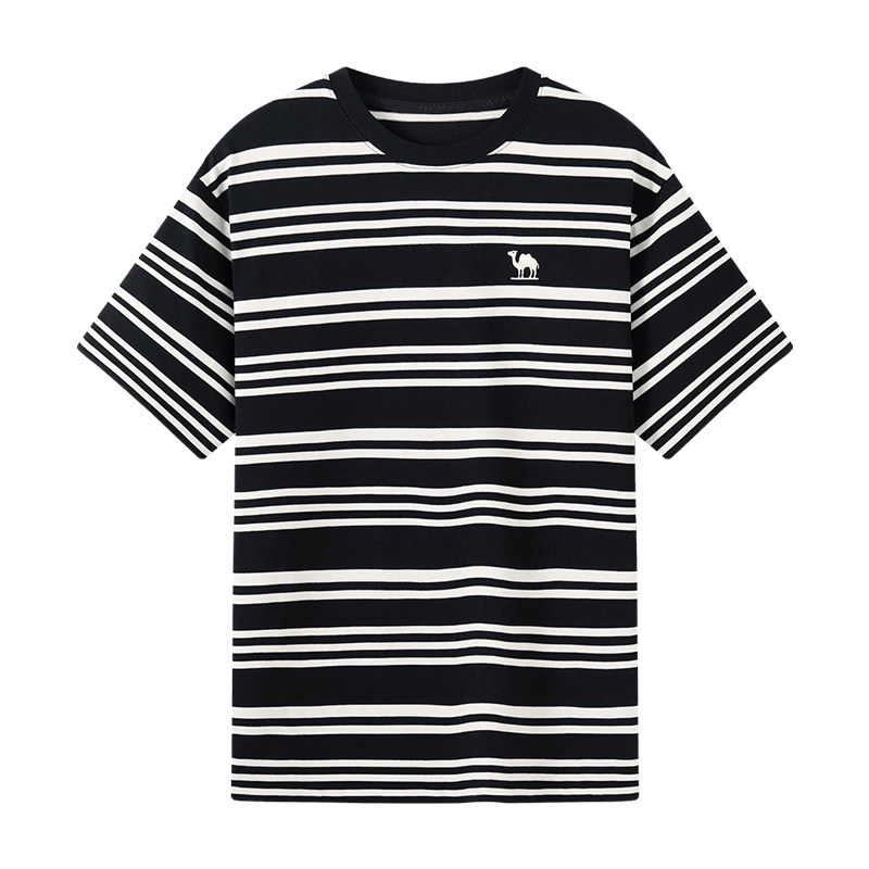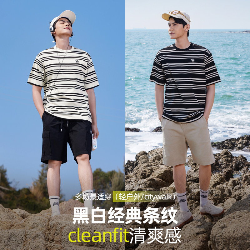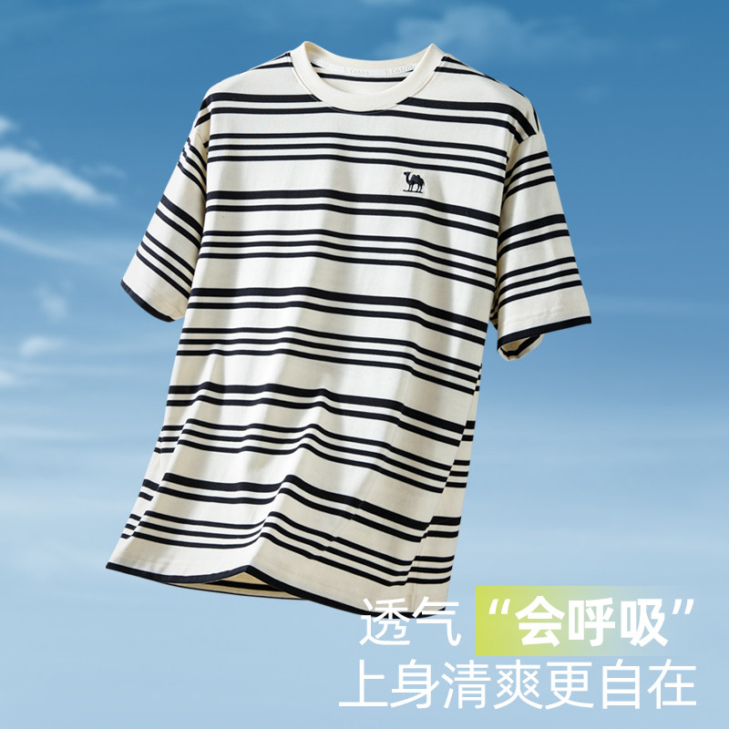 骆驼t恤男夏季25新款男生条纹宽松圆领半袖体恤韩版学院棉感短袖