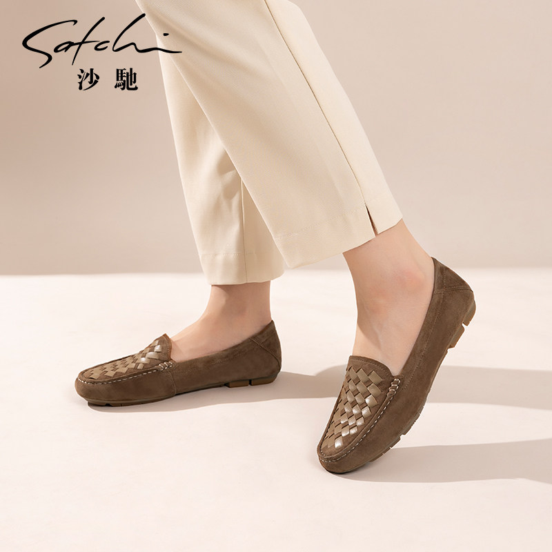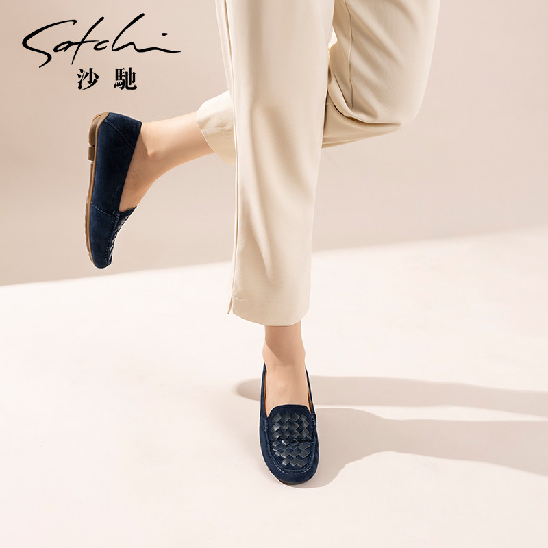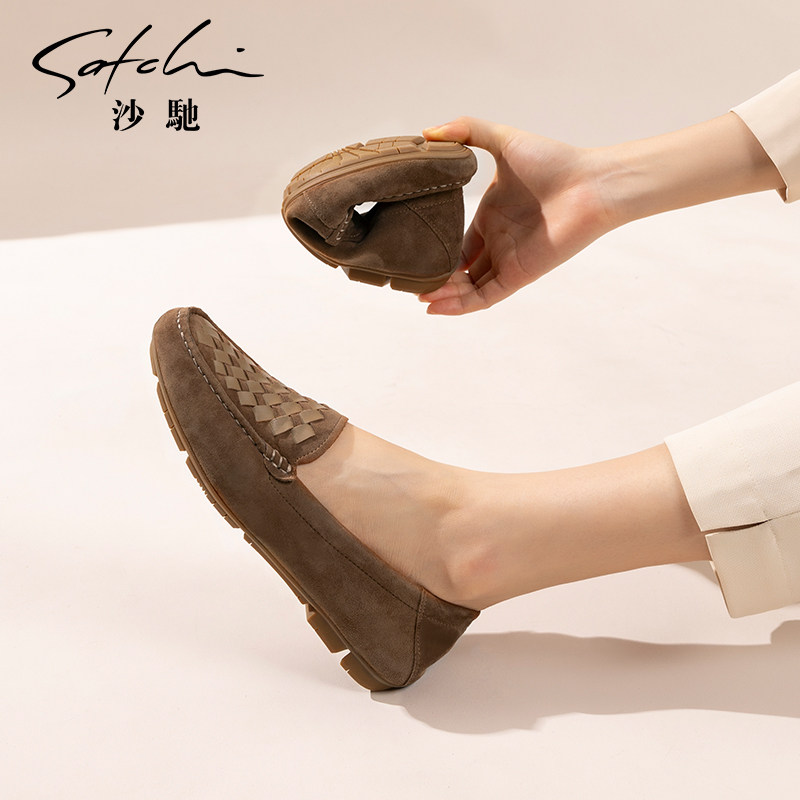 沙驰女鞋潮时尚编织乐福鞋女春秋季新款软底平底豆豆鞋深口单鞋