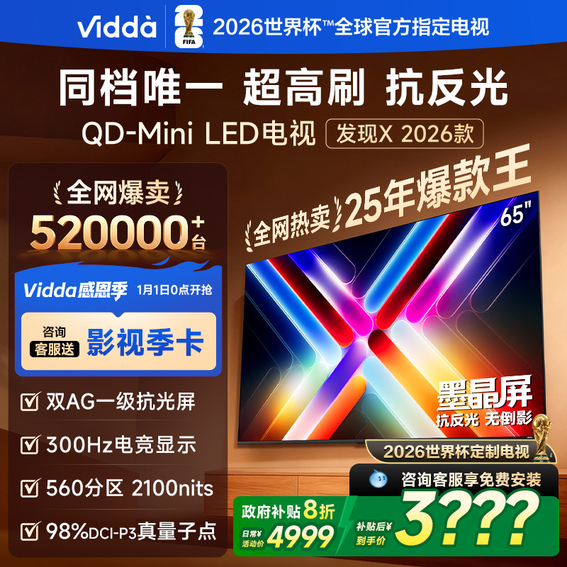 Vidda发现X 2026款 65英寸海信电视机 QD-Mini LED世界杯定制电视