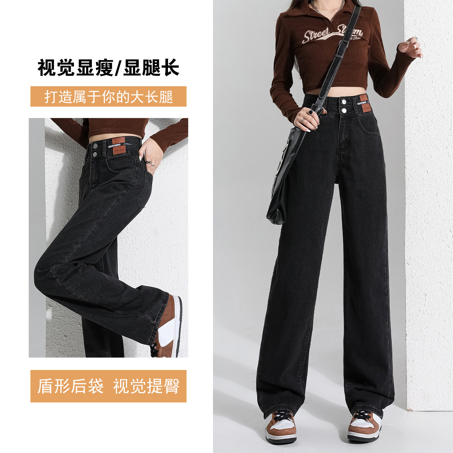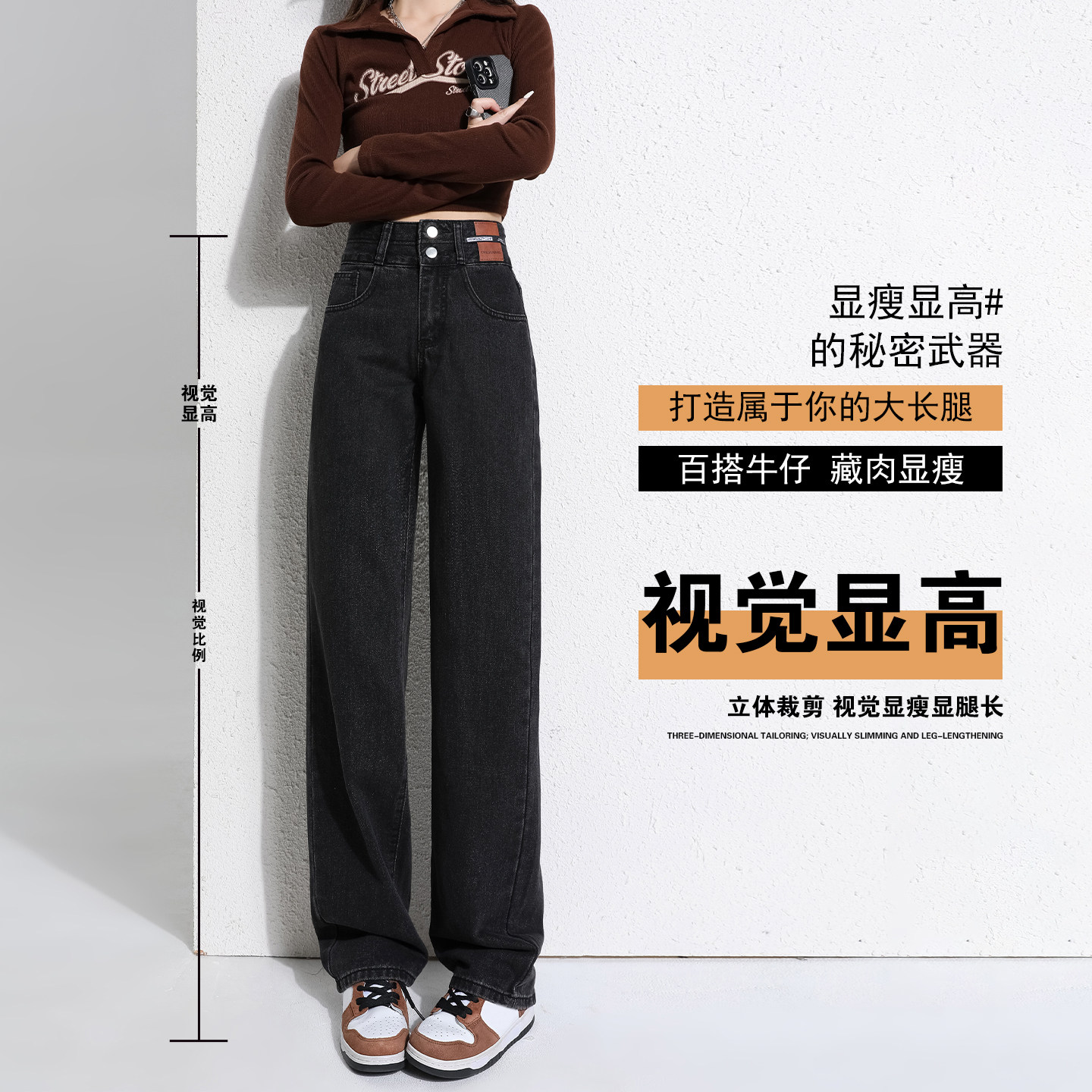 NG真维斯复古直筒牛仔裤女秋冬新款黑色高腰窄版小个子加绒阔腿裤