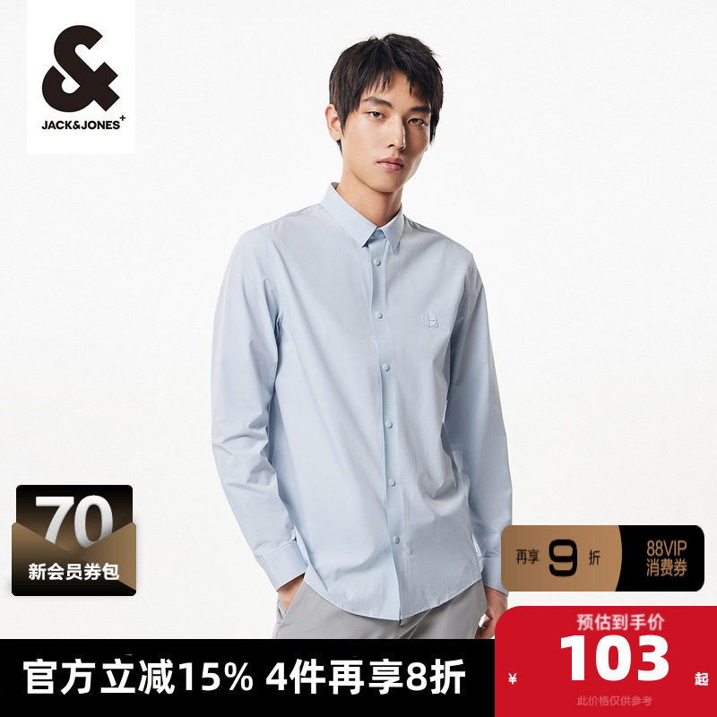 杰克琼斯2024春季新款男士直筒翻领logo胶印长袖纯色衬衫男款男装
