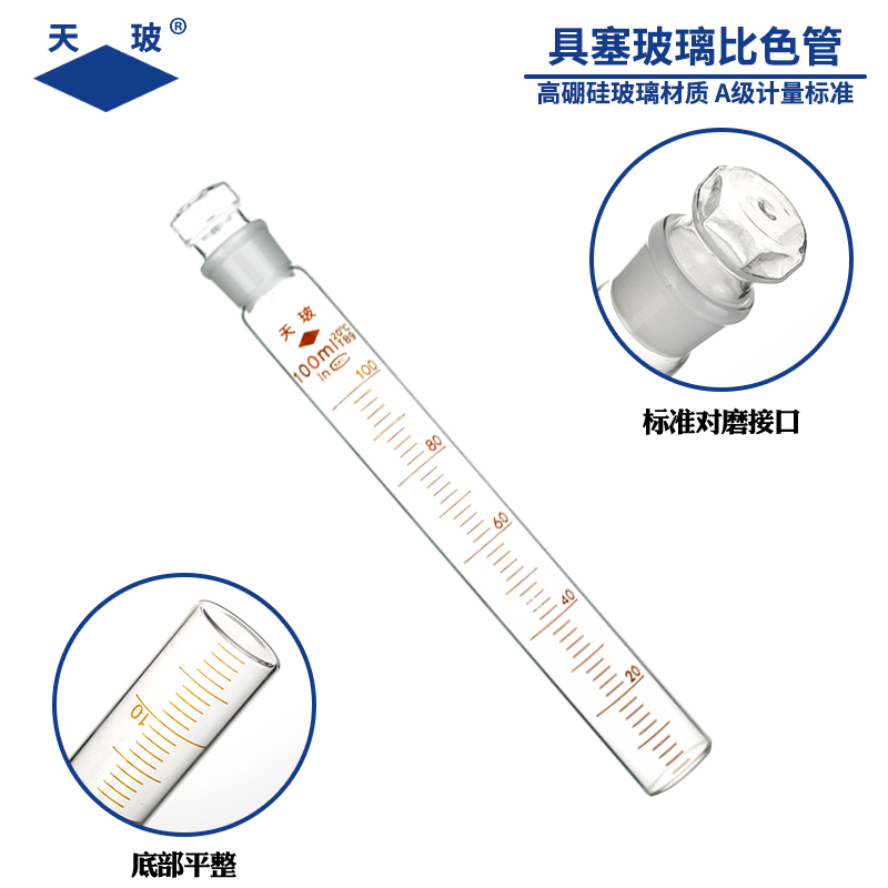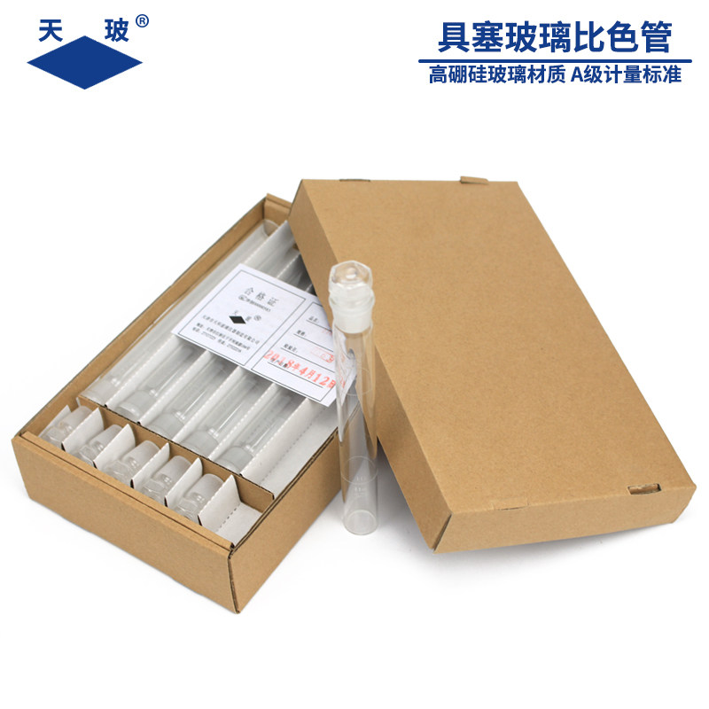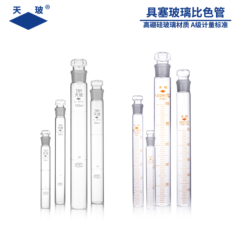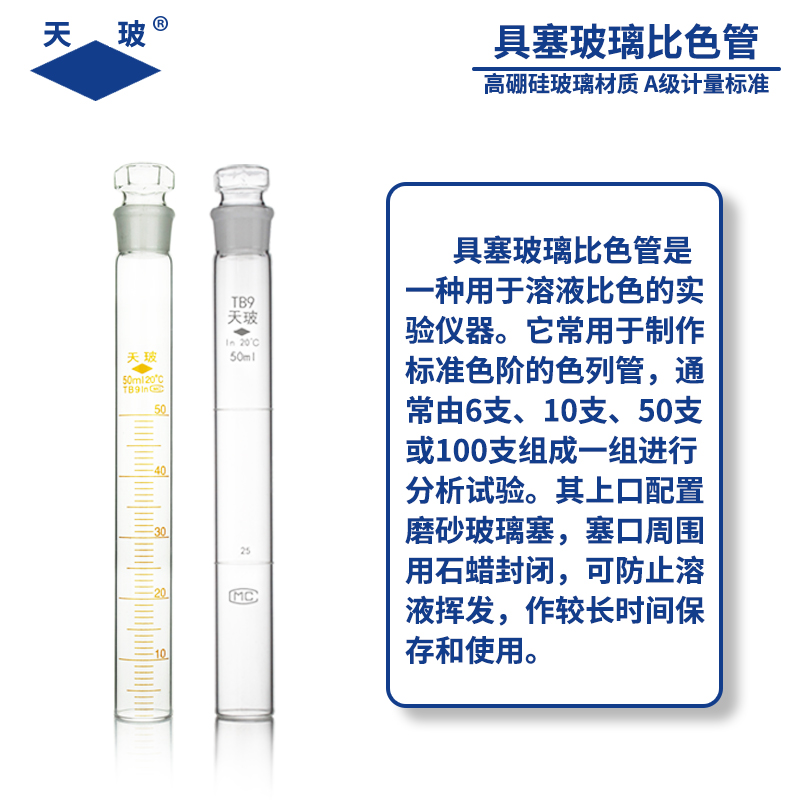 天玻 比色管 带刻度10/25/50/100ml纳氏比色管 无硼塑料比色管 带塞试管玻璃具塞 可选有机玻璃比色管架