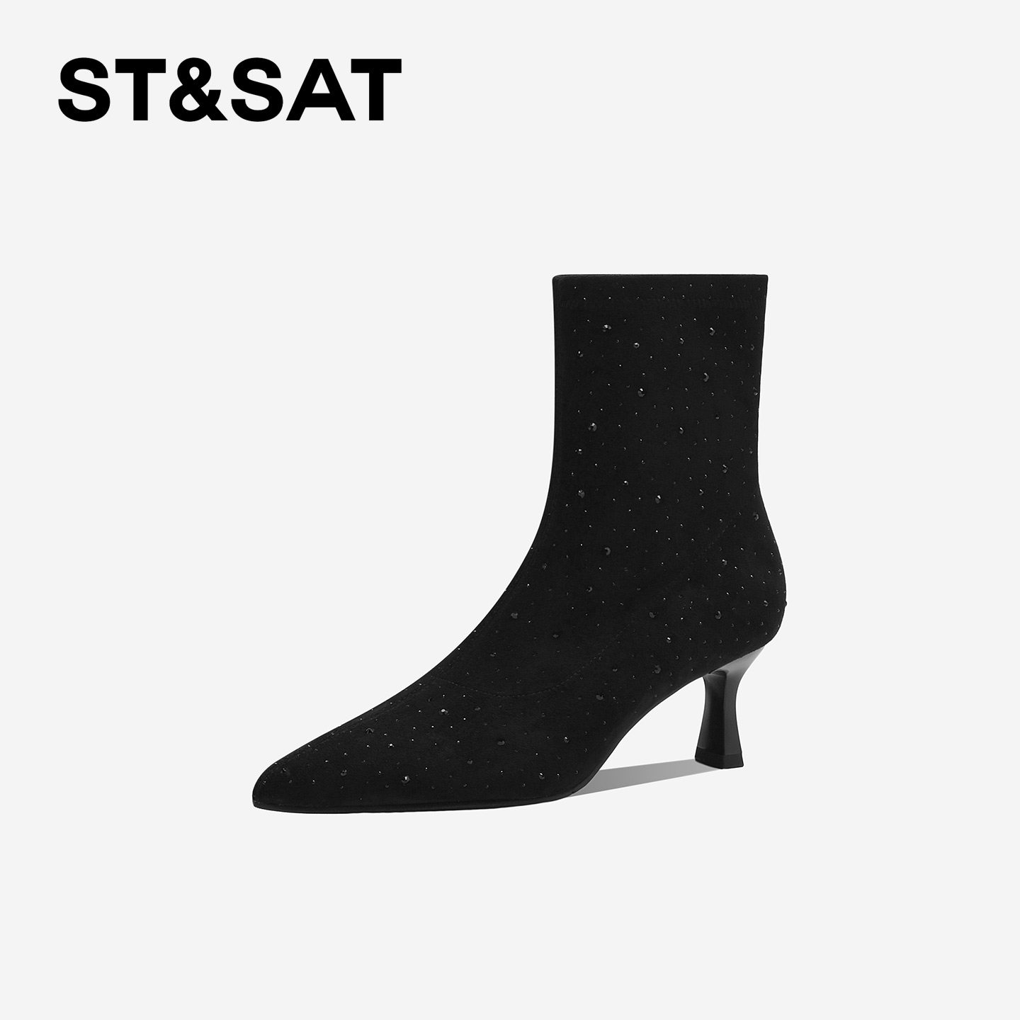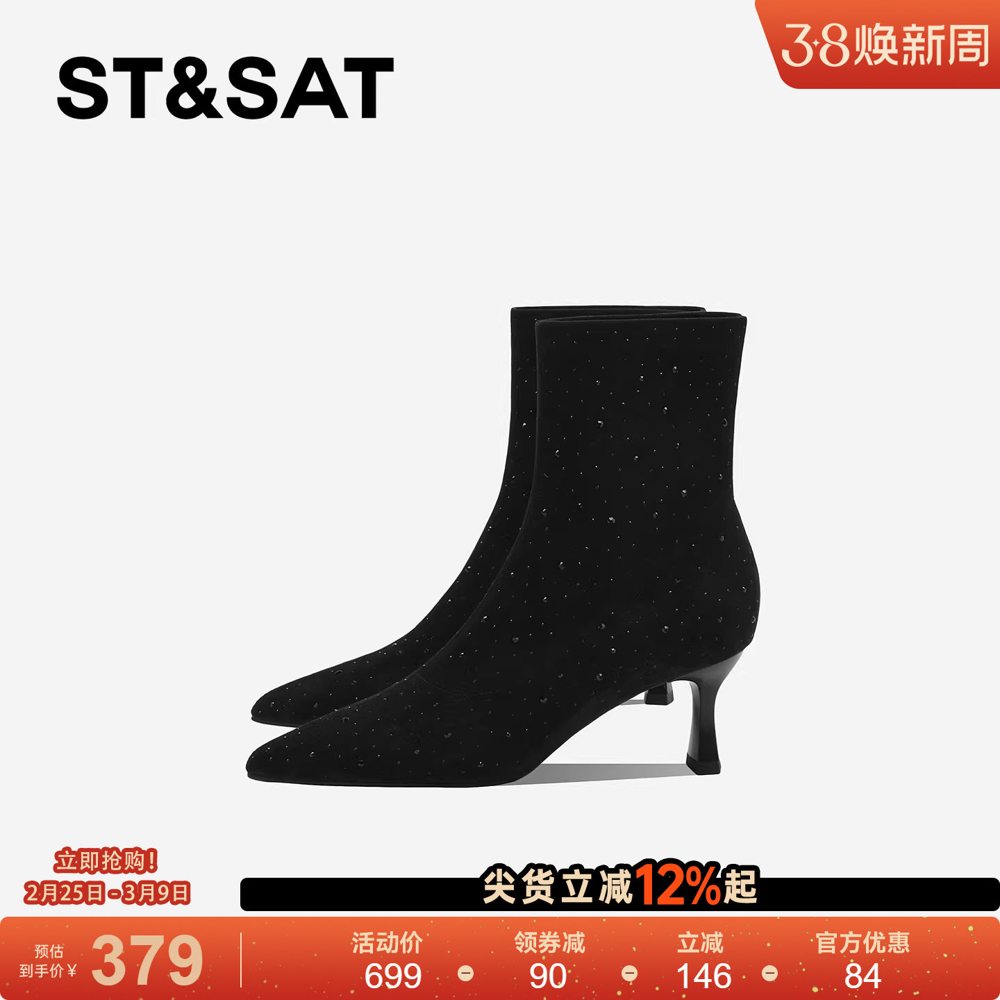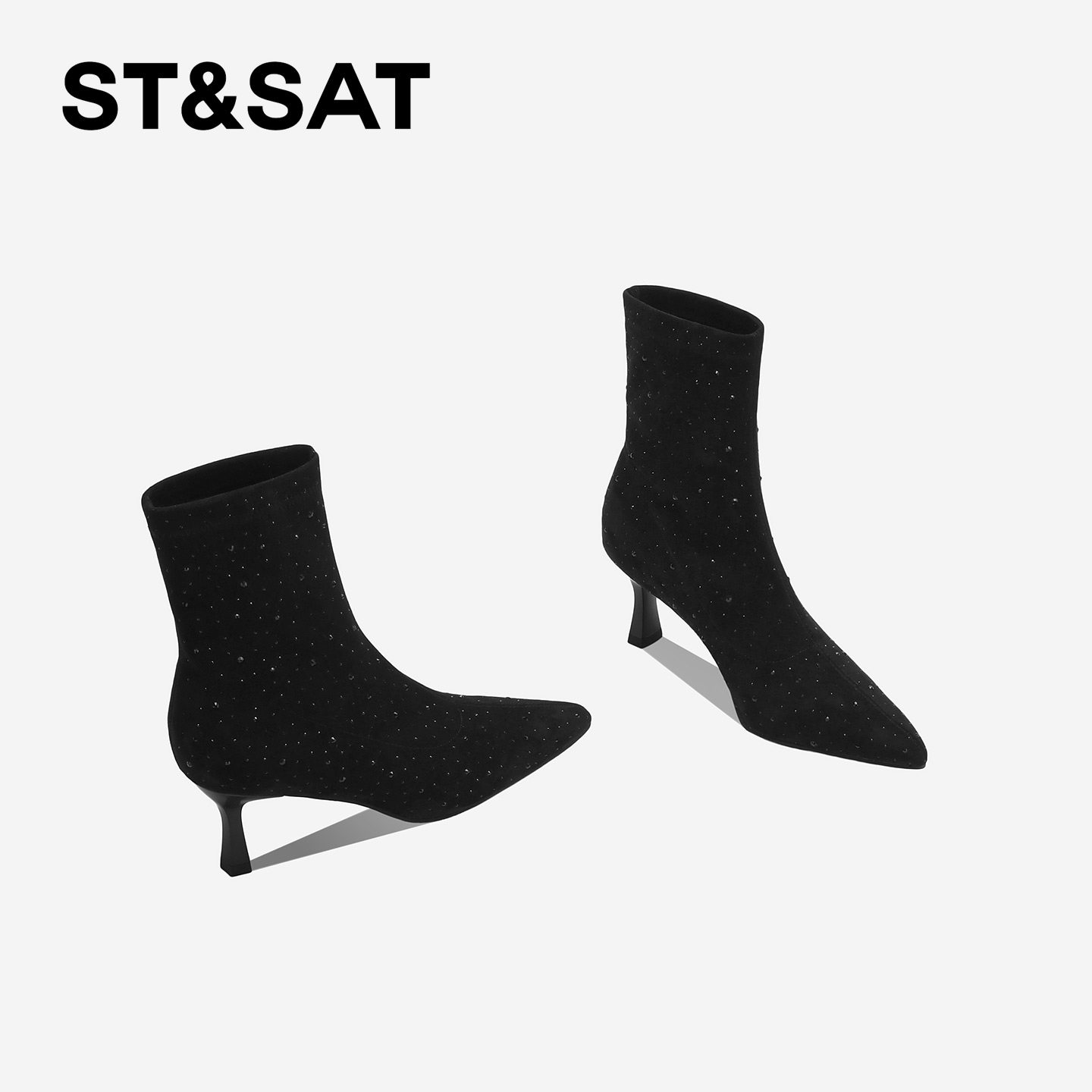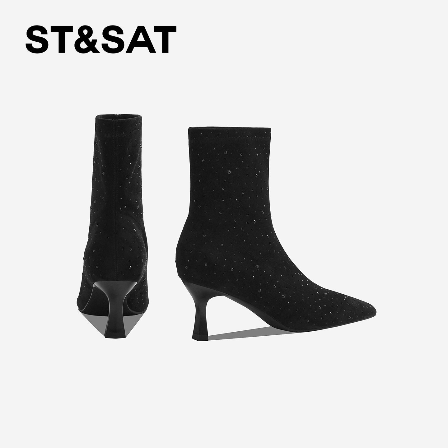 星期六法式短靴女2025秋冬尖头水钻细跟时装靴黑色满天星弹力靴子