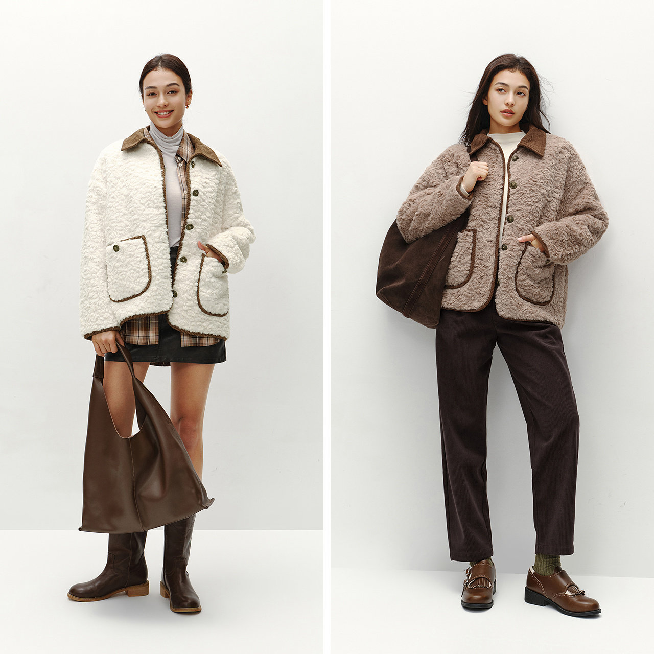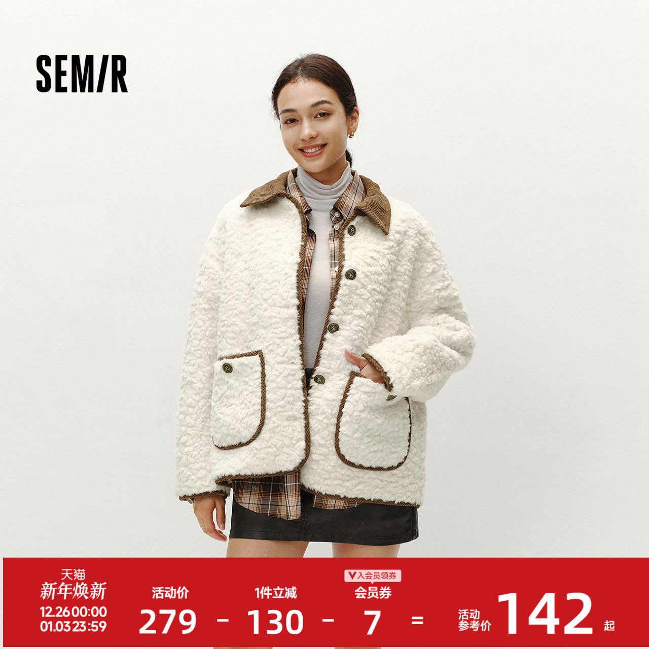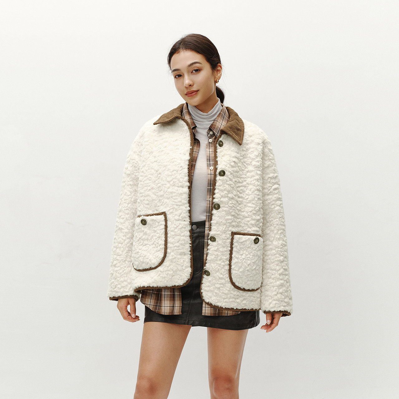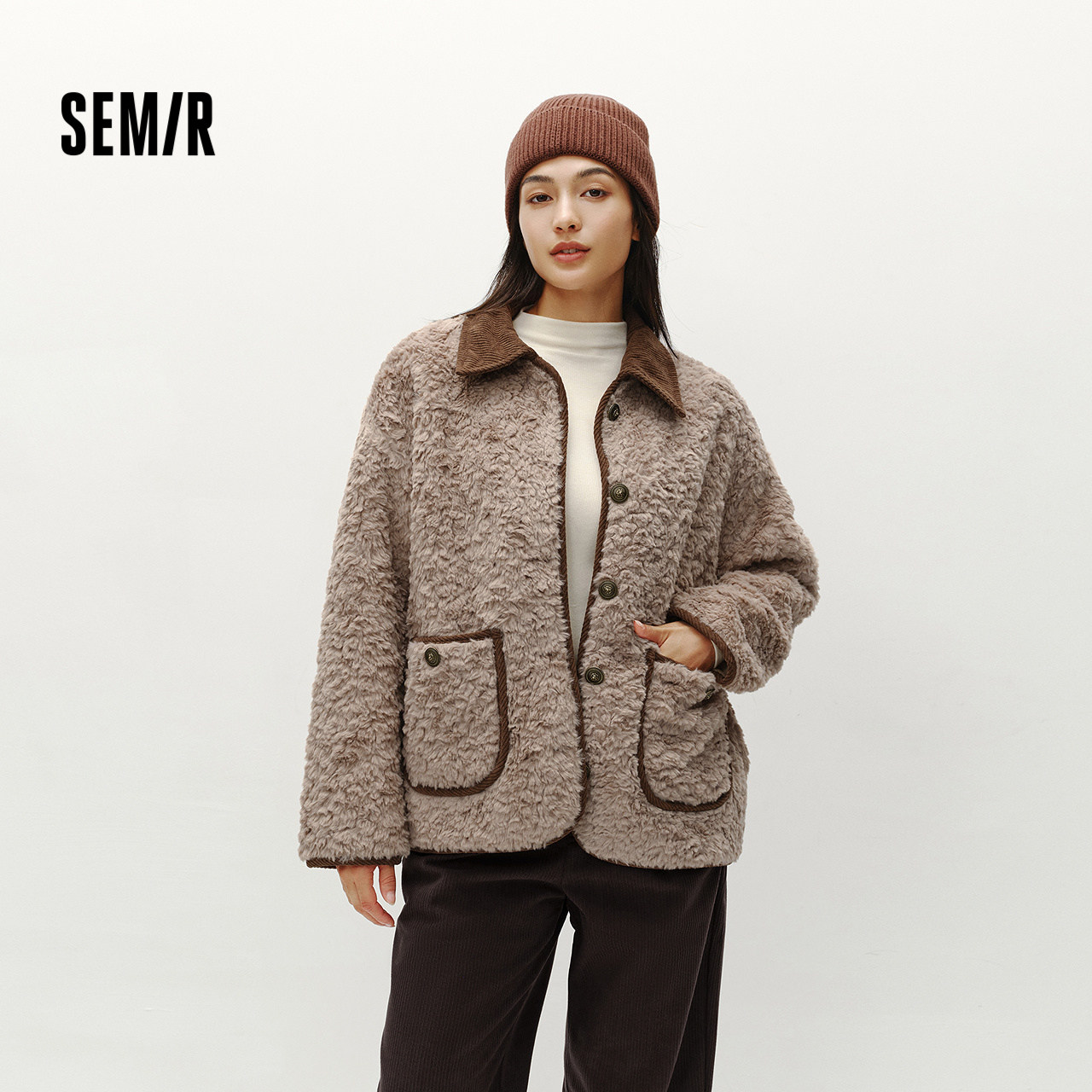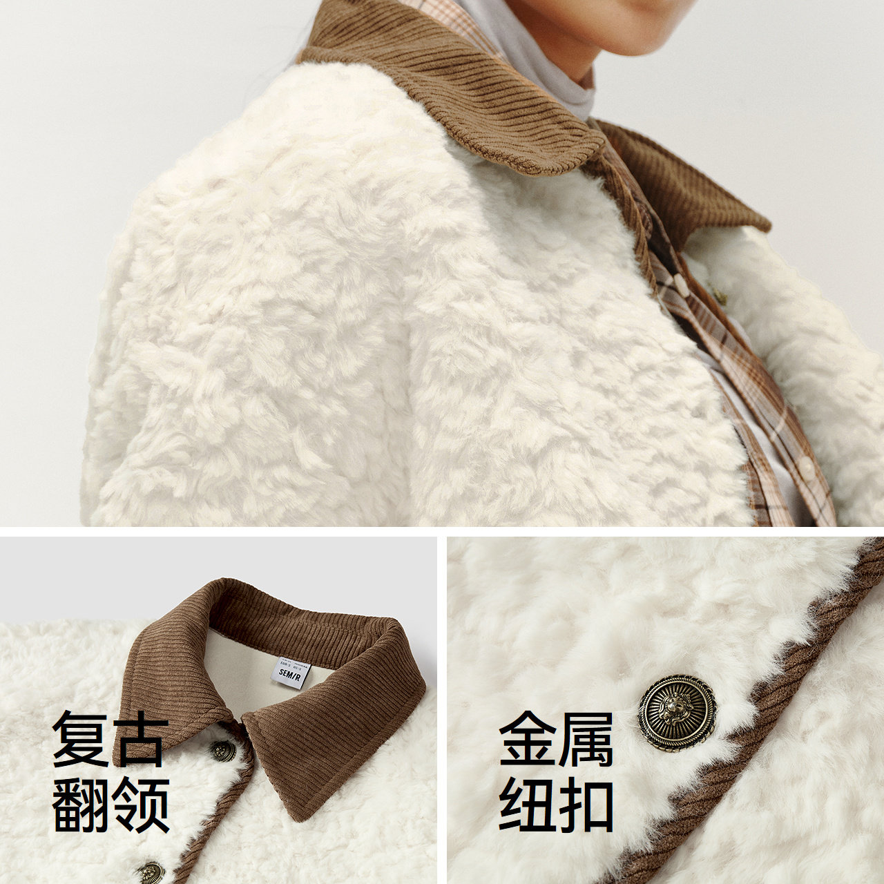 森马外套女冬仿兔毛拼接灯芯绒翻领宽松落肩上衣气质复古潮流夹克