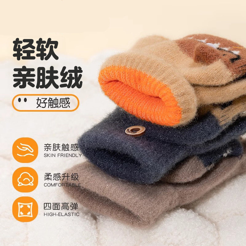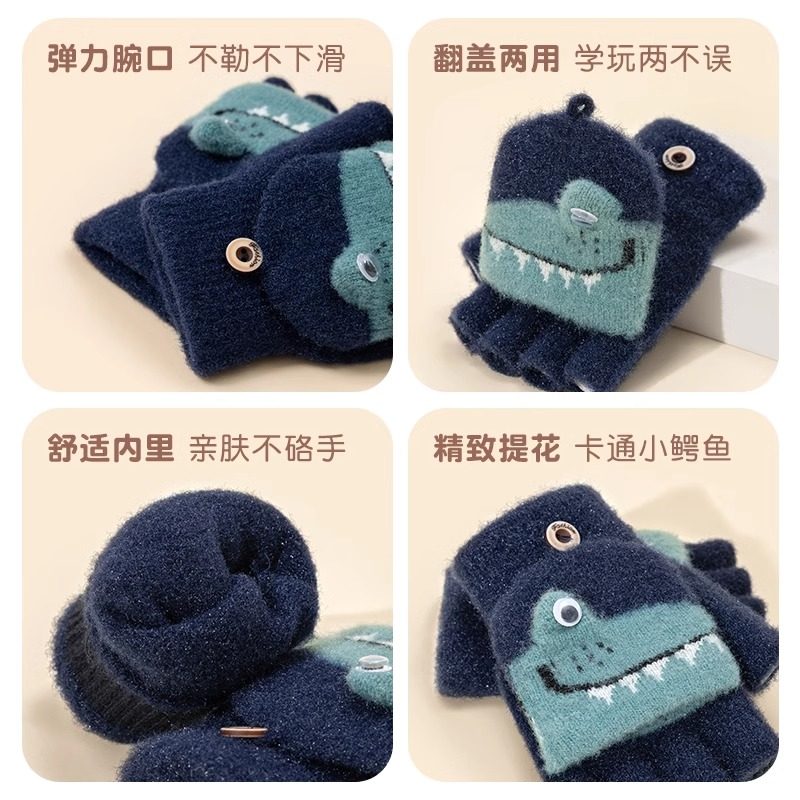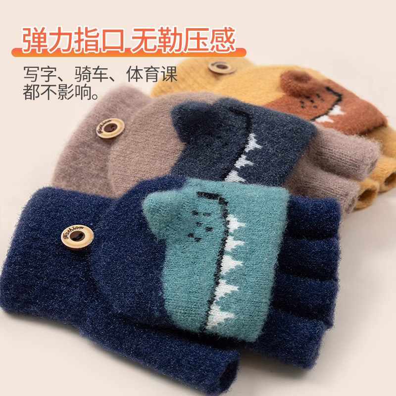 儿童手套男童冬季保暖翻盖小学生半指女童骑车五指薄款写字黑色