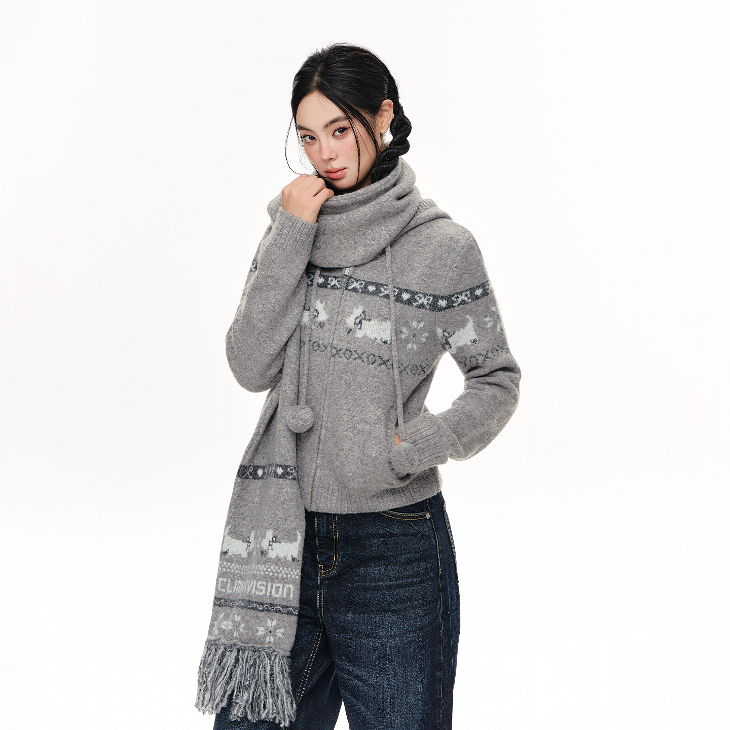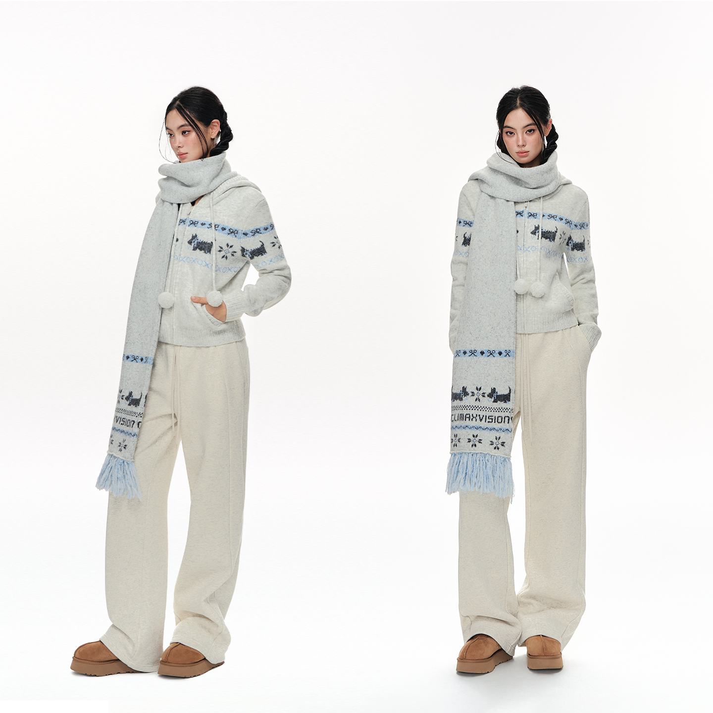 CLIMAX VISION羊毛混纺西高地狗狗提花撞色慵懒针织连帽开衫毛衣