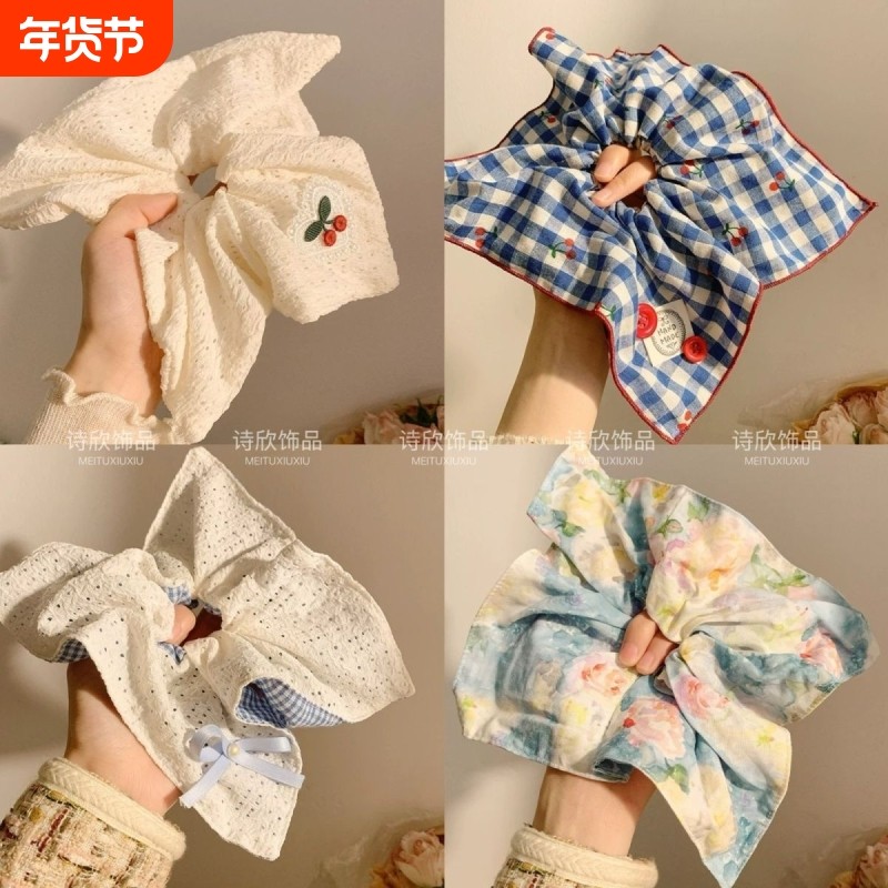 韩系蓝色格子方巾大肠发圈女方形头绳高级感慵懒风扎头发大号发饰