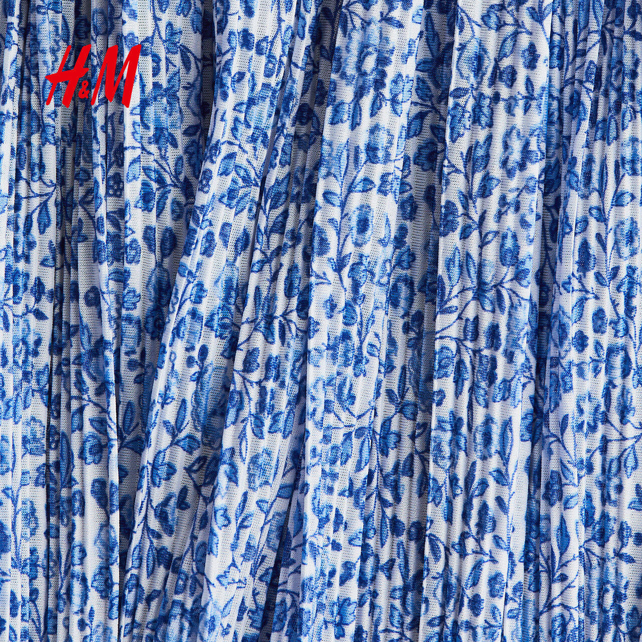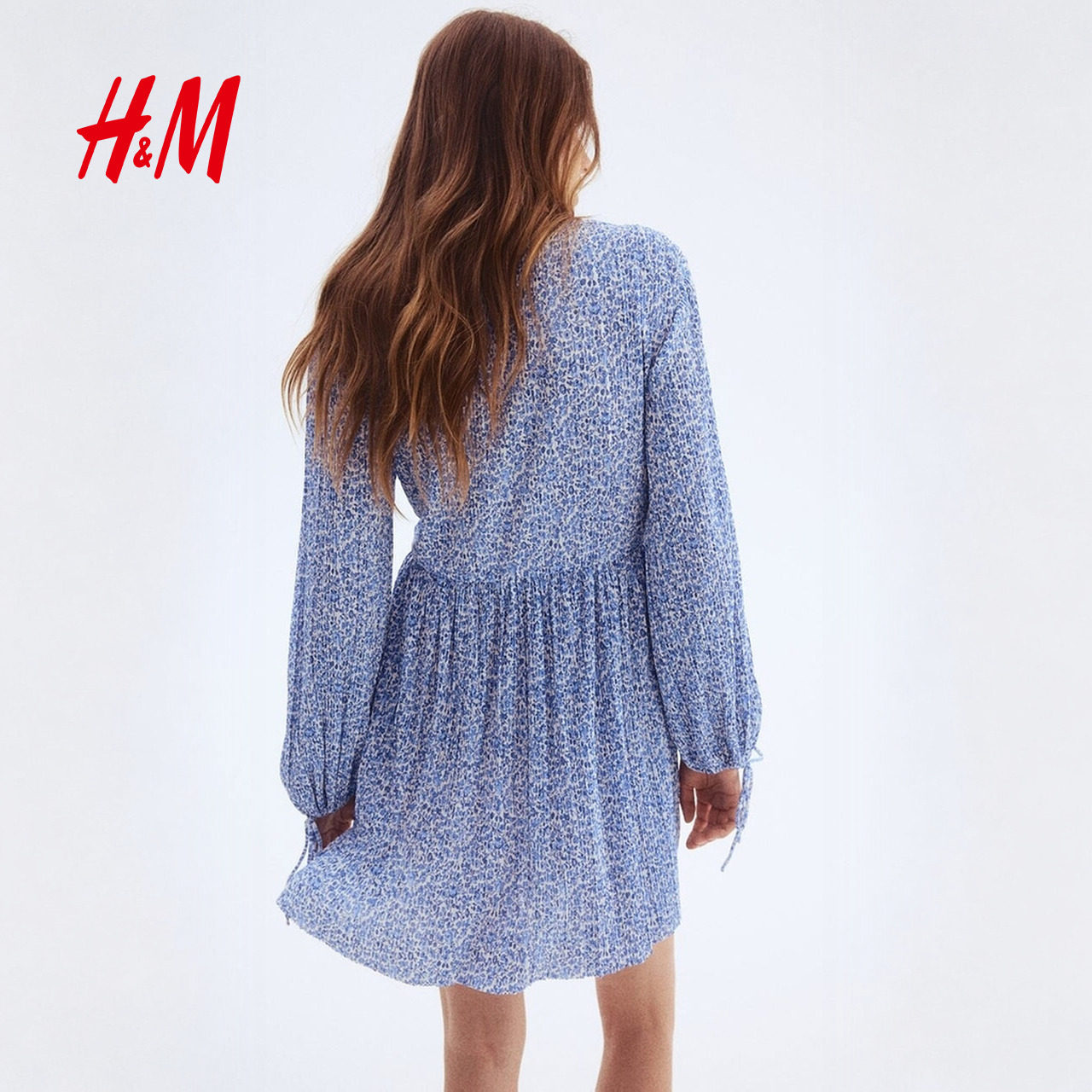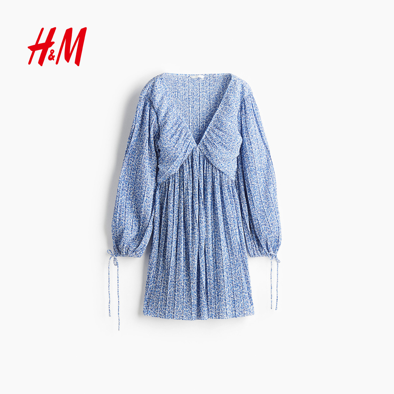 HM女装连衣裙冬季海边v领褶纹长袖设计感碎花裙1295133