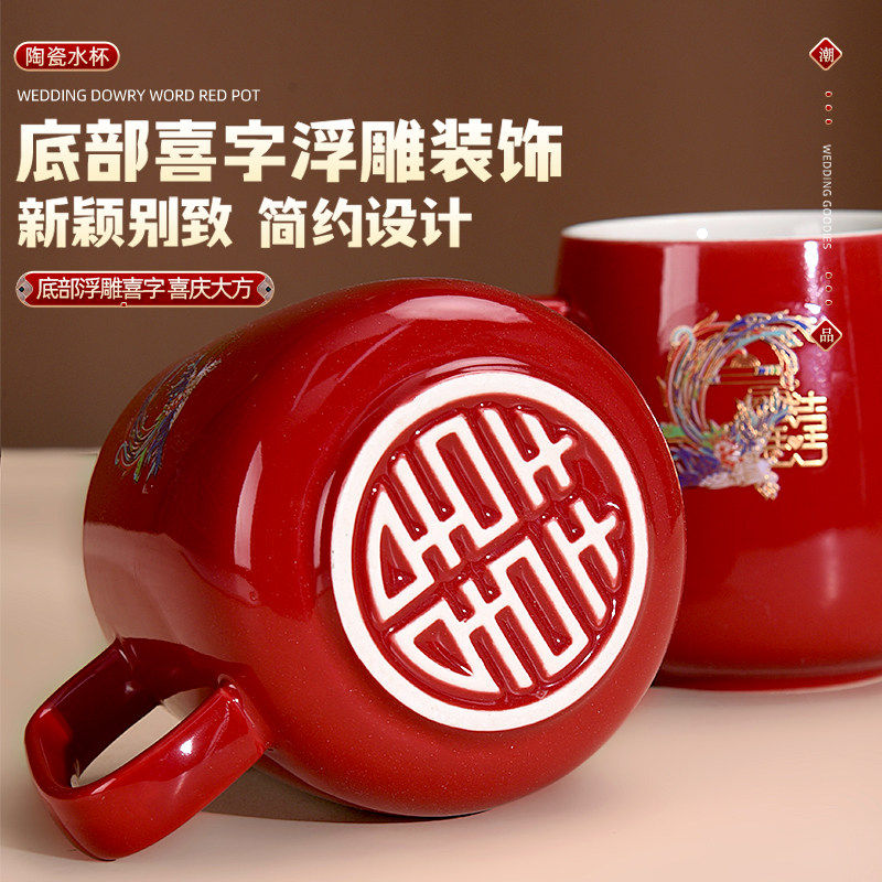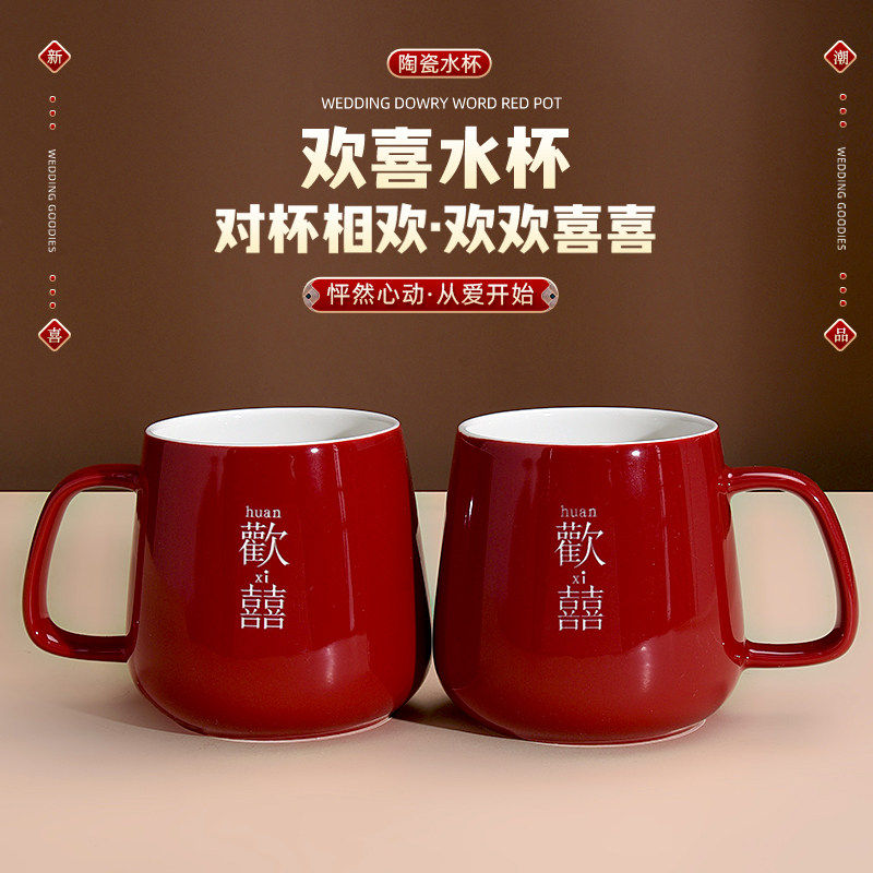 结婚红色陶瓷水杯新娘新郎喝水情侣对杯陪嫁牙杯一对实用杯子礼物