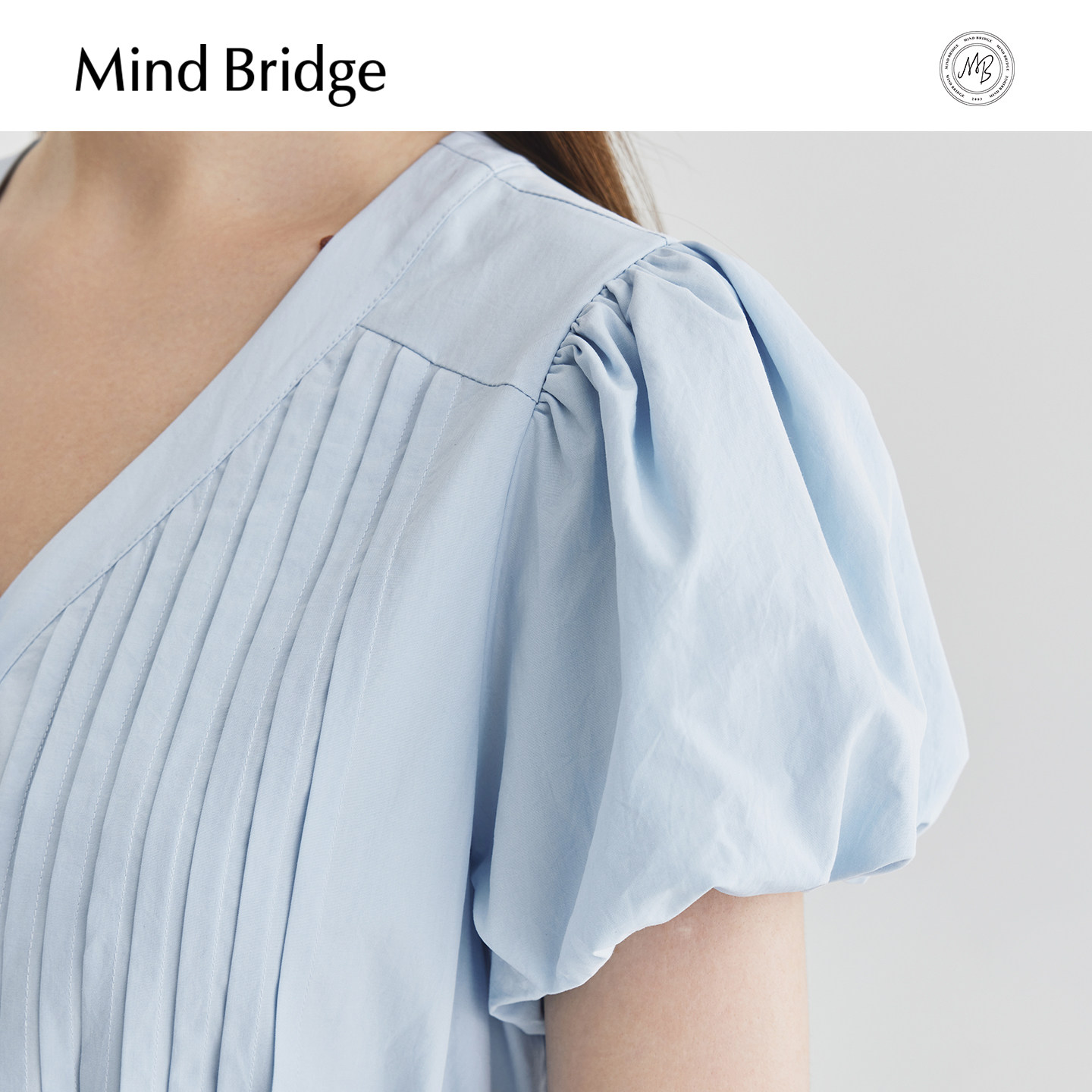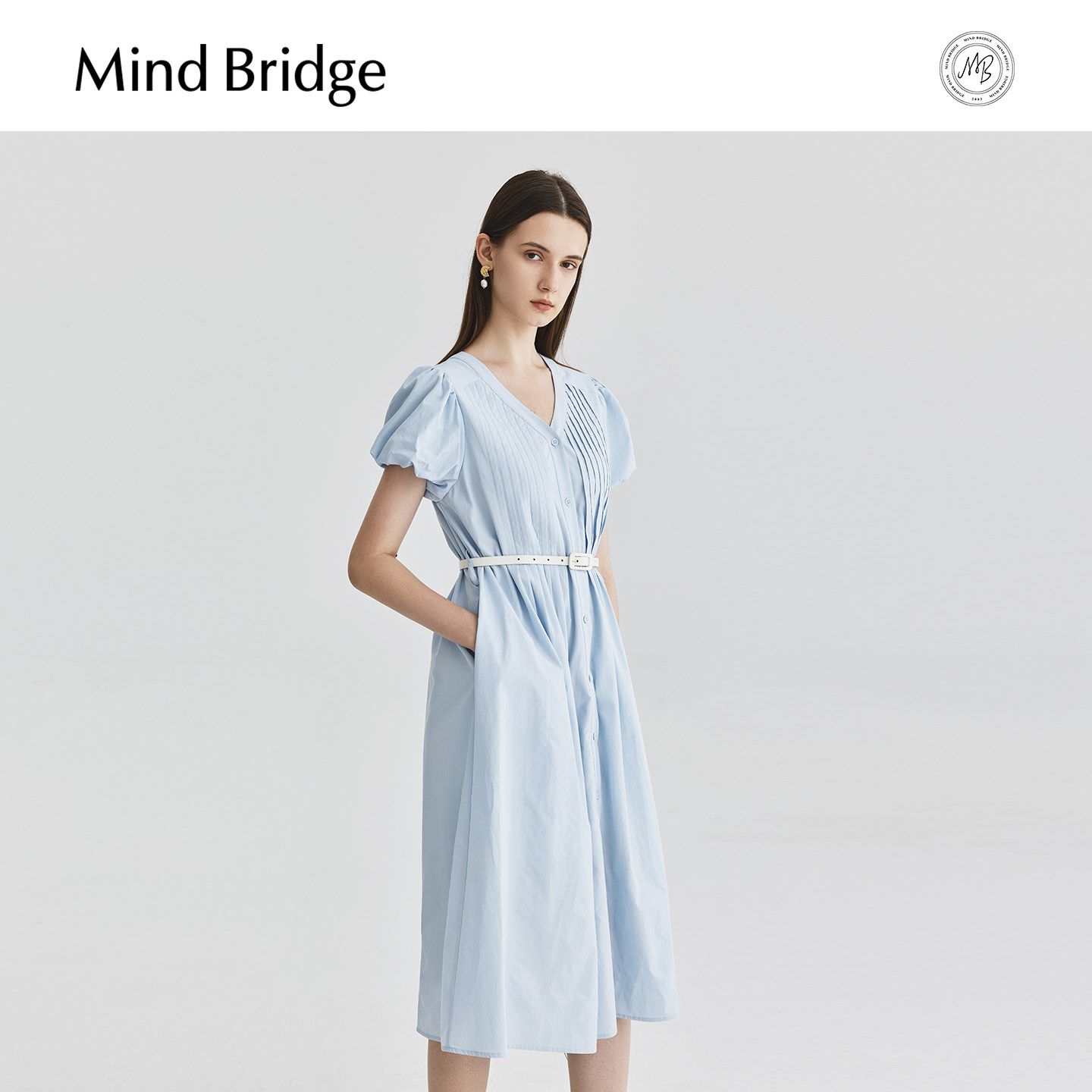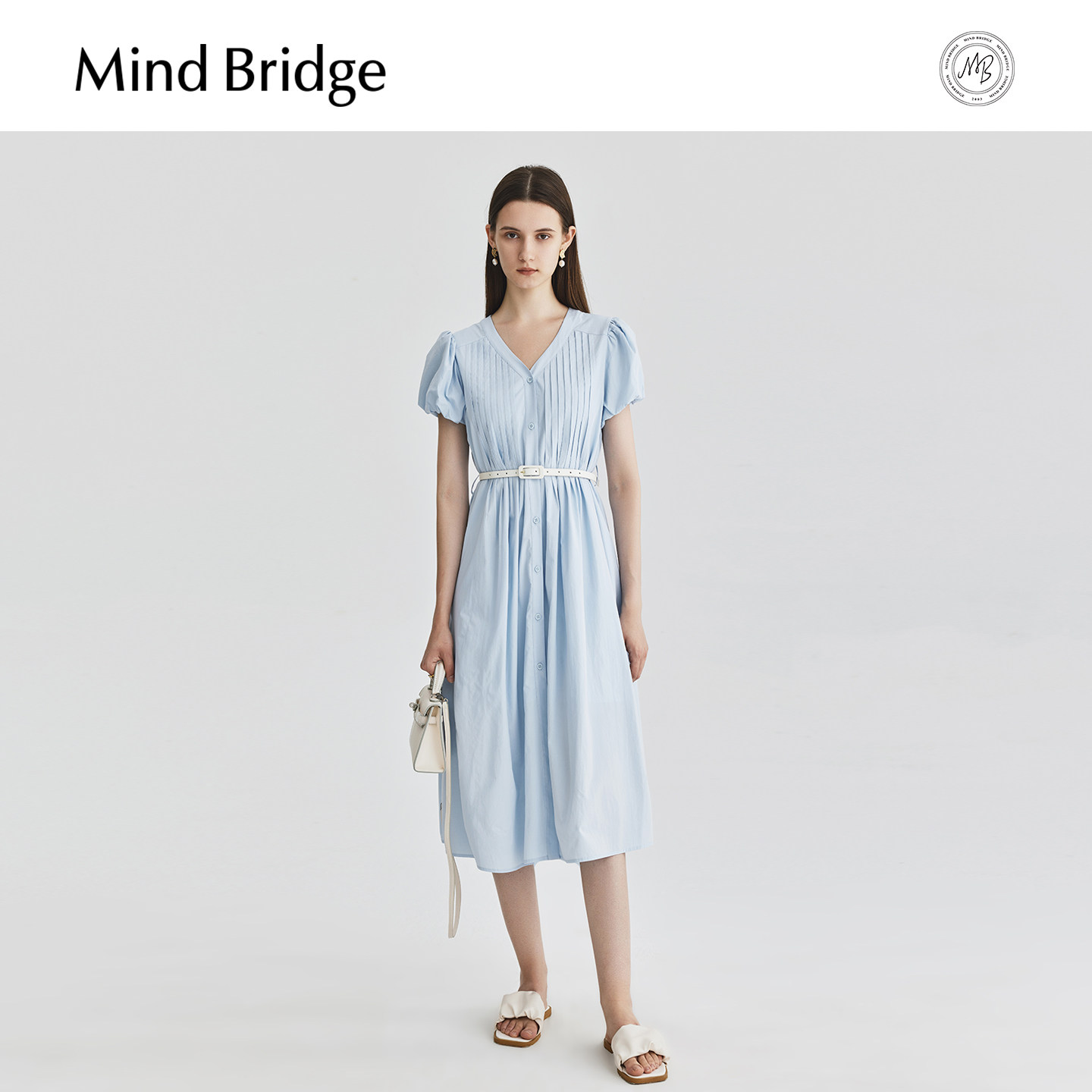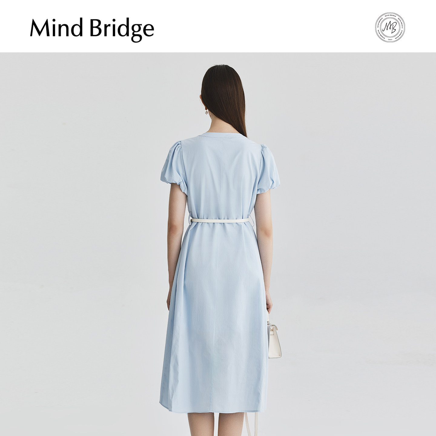 Mind Bridge【莱赛尔】V领连衣裙女士设计感裙子夏季泡泡袖中长裙