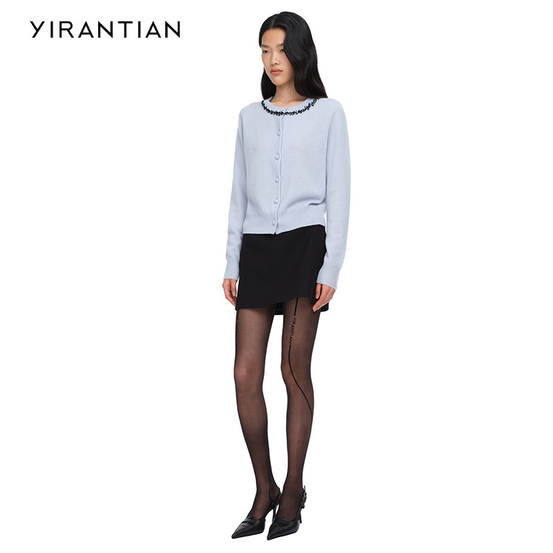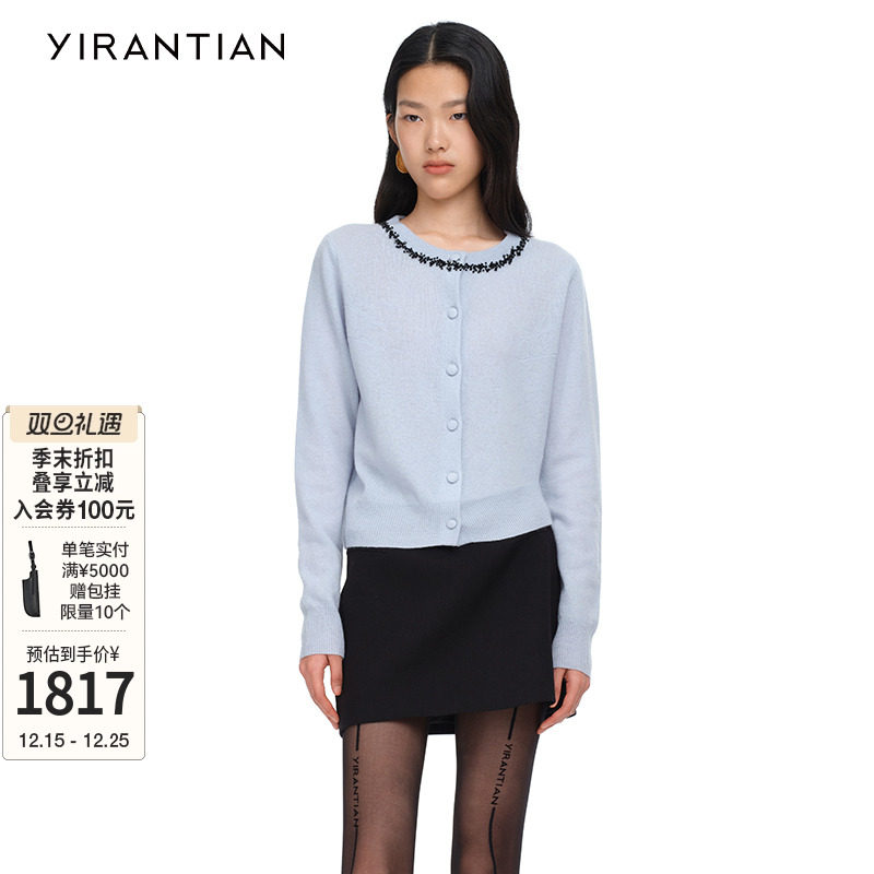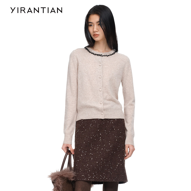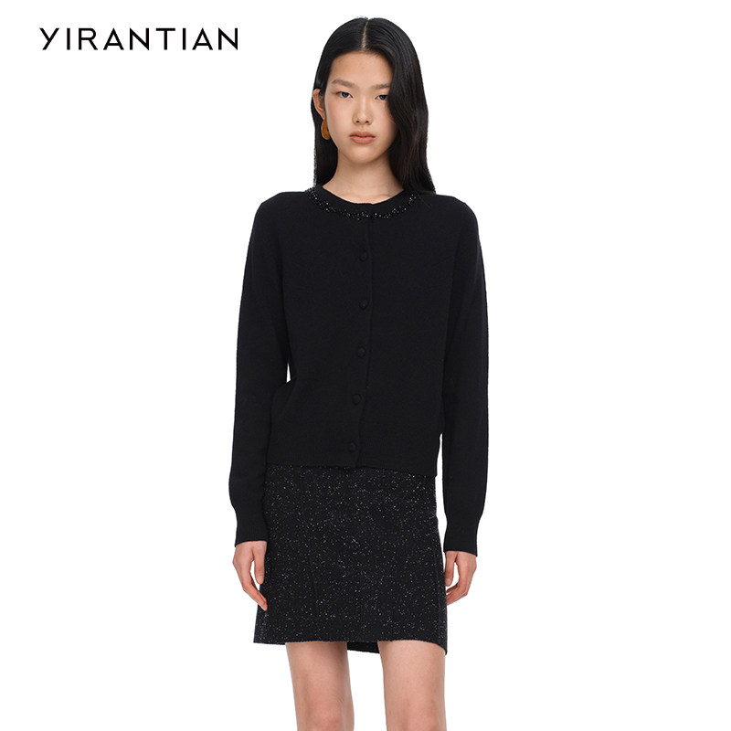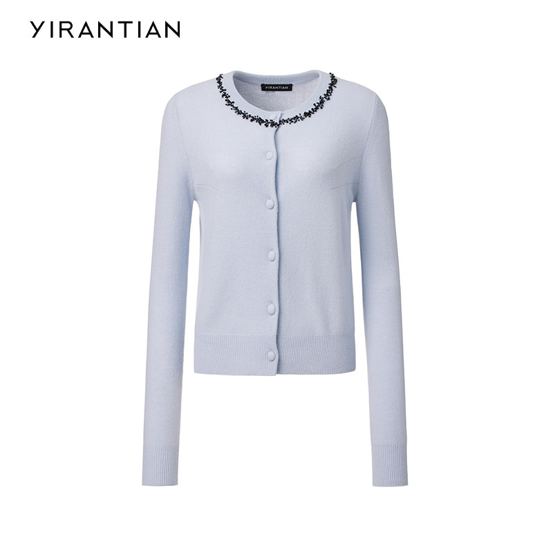 【YIRANTIAN】设计秋冬柔软细腻舒适圆领宽松钉珠开衫上衣女