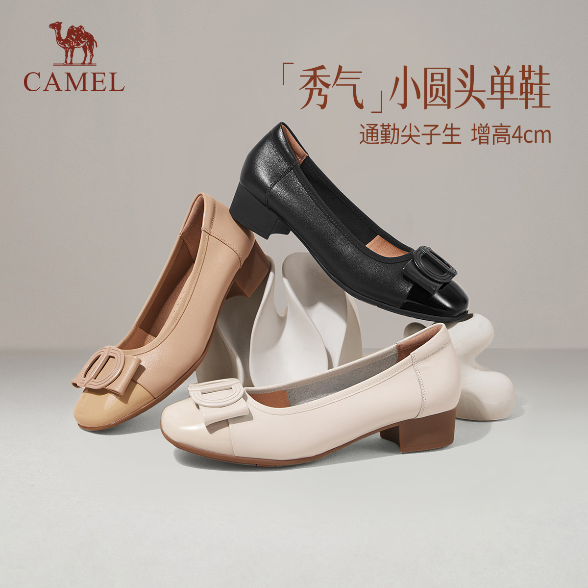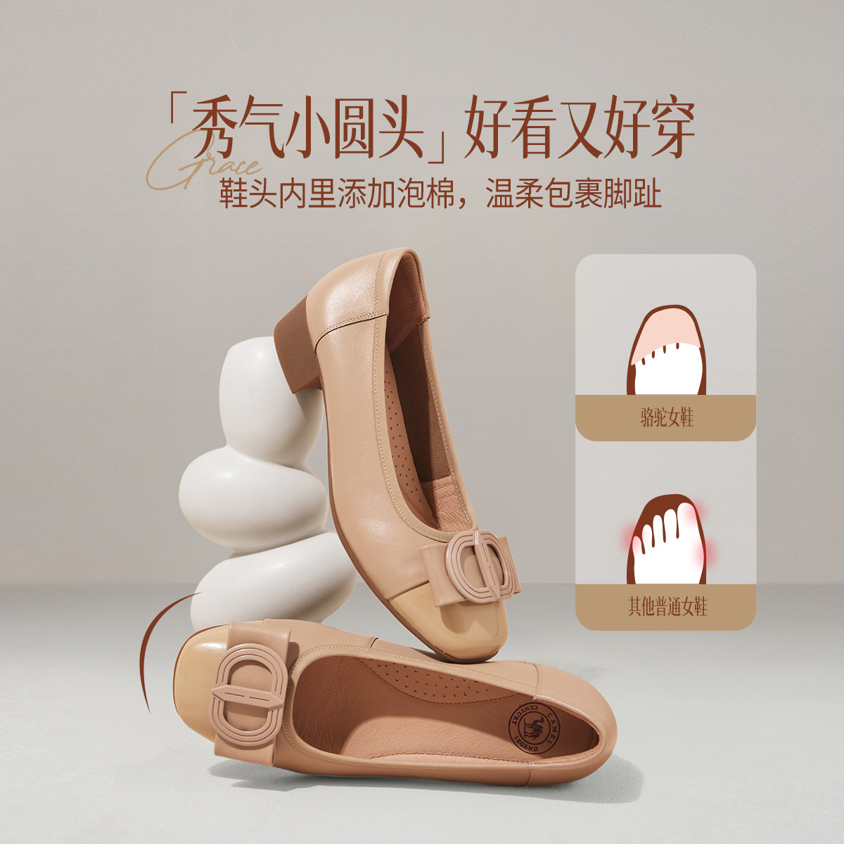 骆驼女鞋2026春季新款柔软牛皮单鞋粗跟通勤玛丽珍芭蕾鞋女奶奶鞋