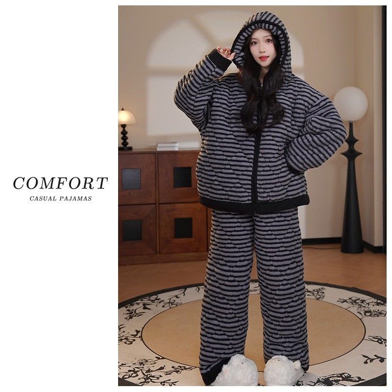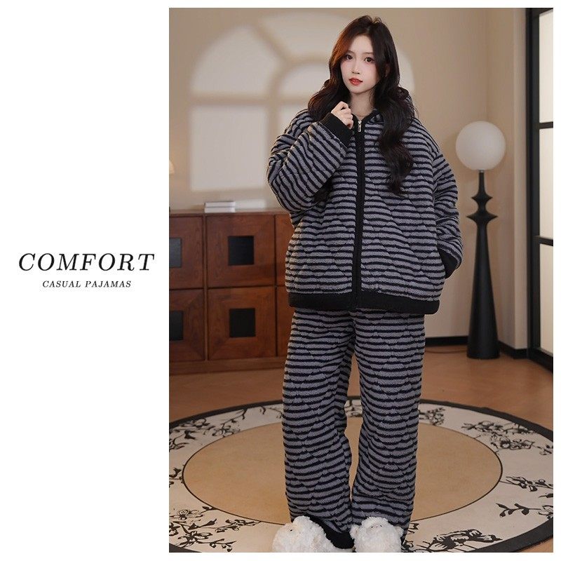 睡衣女冬季珊瑚绒三层夹棉加厚加绒可外穿韩版条纹女士保暖家居服