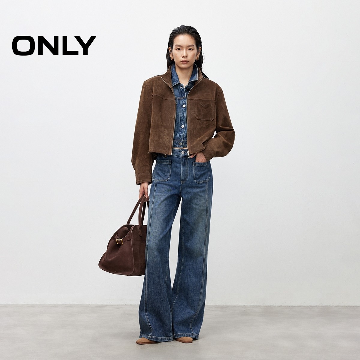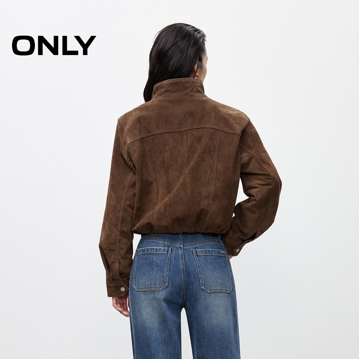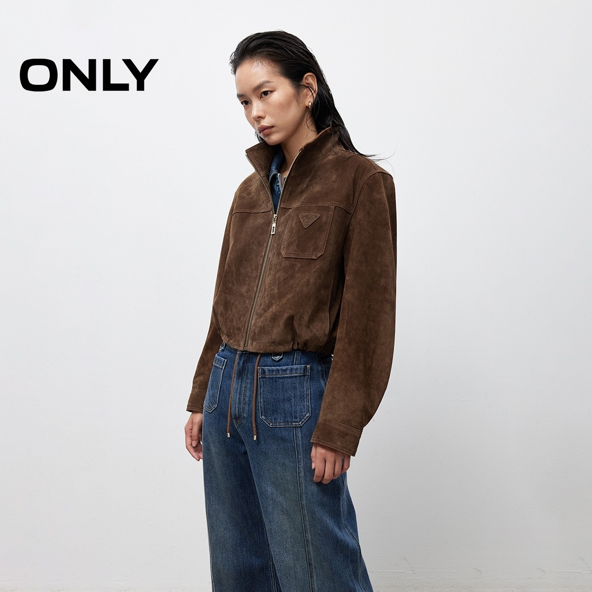 ONLY2025冬季新款酷感防风立领可调节抽绳下摆宽松短款皮衣外套女