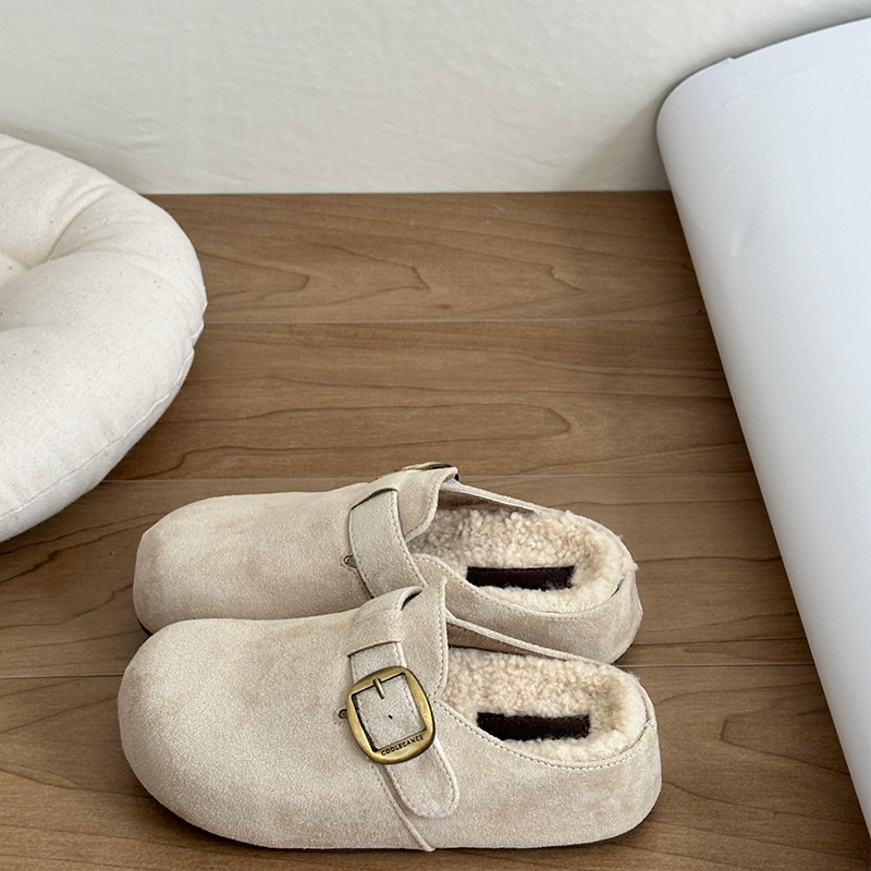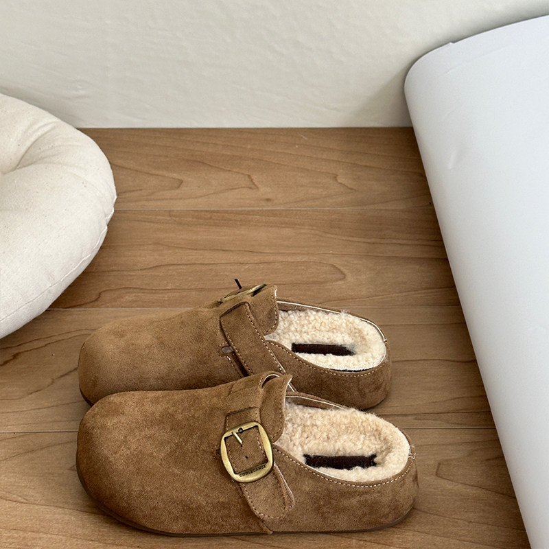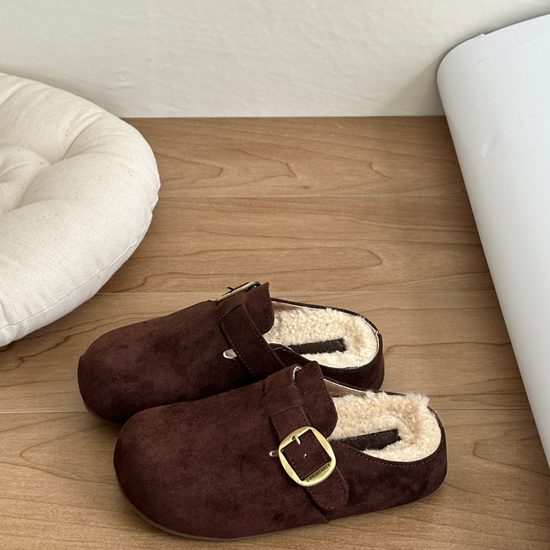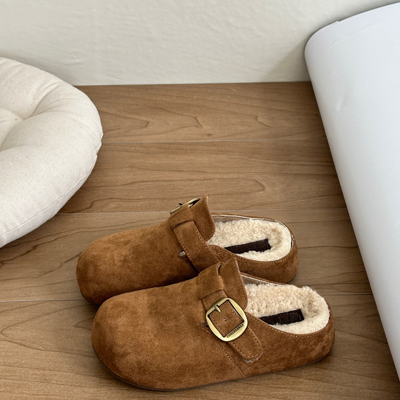 森系复古厚底内增高勃肯鞋女外穿防滑百搭加绒保暖毛毛包头半拖鞋