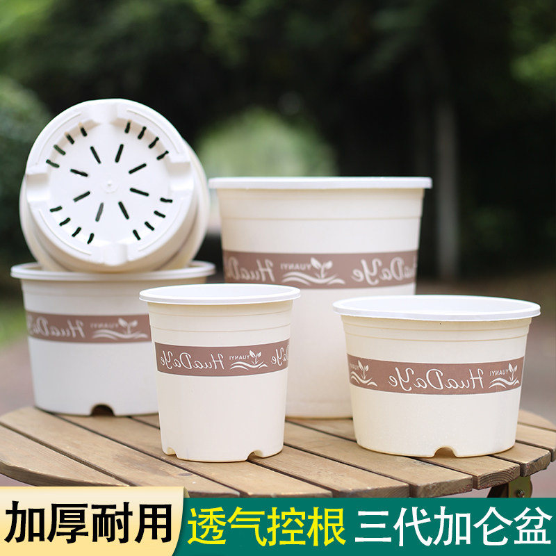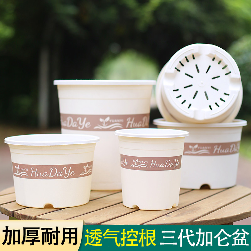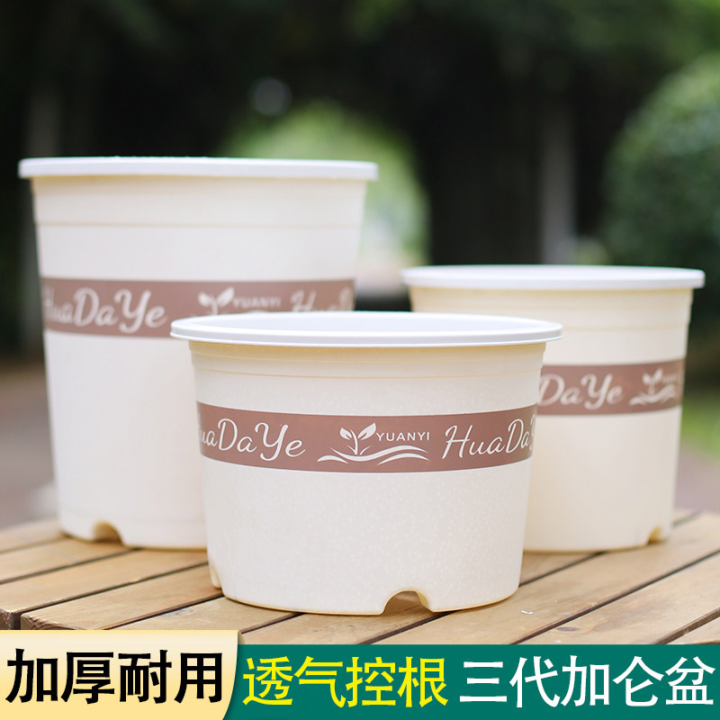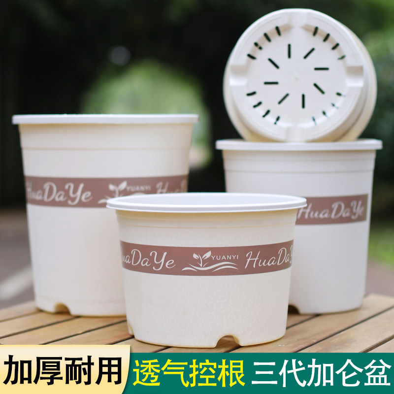 塑料树脂圆形控根透气排水绿植盆栽白色三代加仑盆带托盘客厅高款