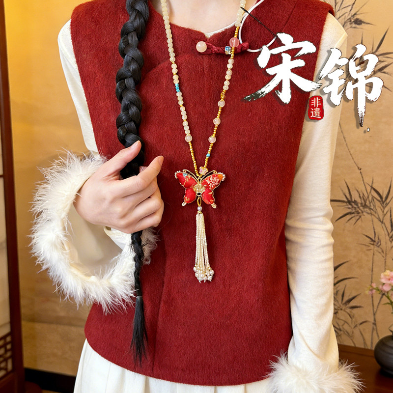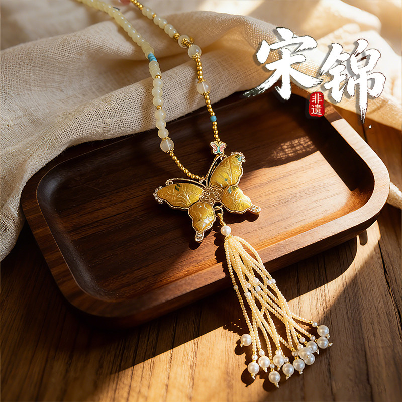 新中式宋锦双面蝴蝶项坠手工串珠流苏吊坠毛衣链粉色复古配饰珠链