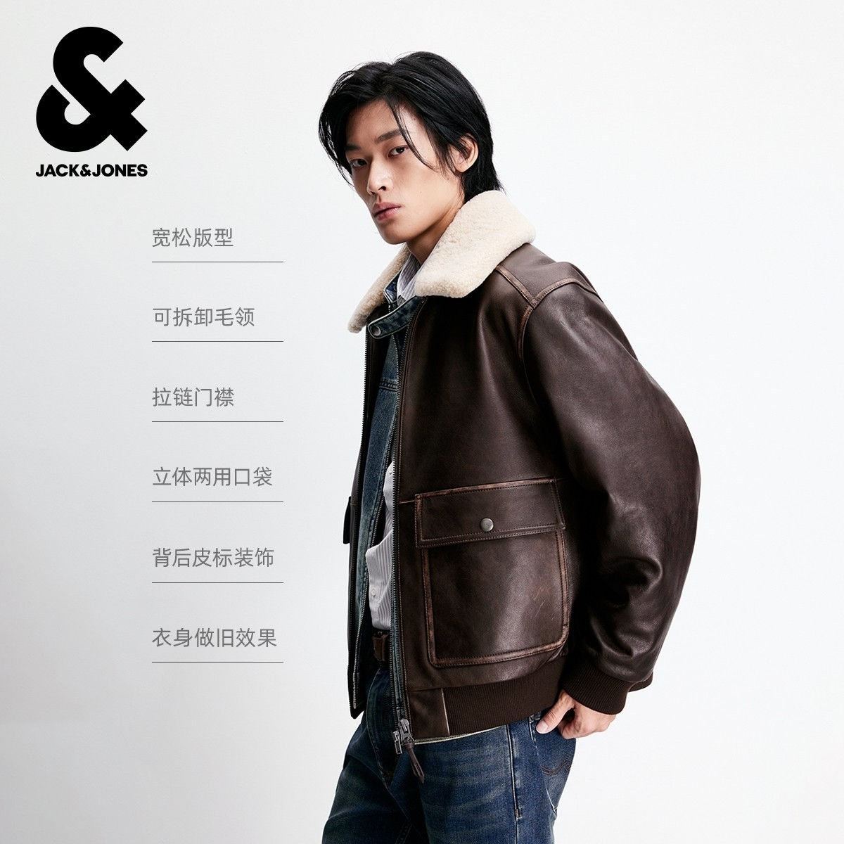 杰克琼斯男装2025年冬季新款皮衣美式复古可拆卸毛领夹克外套