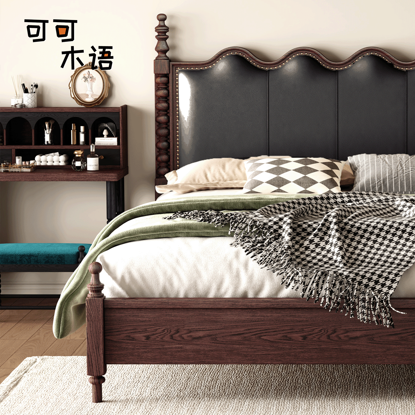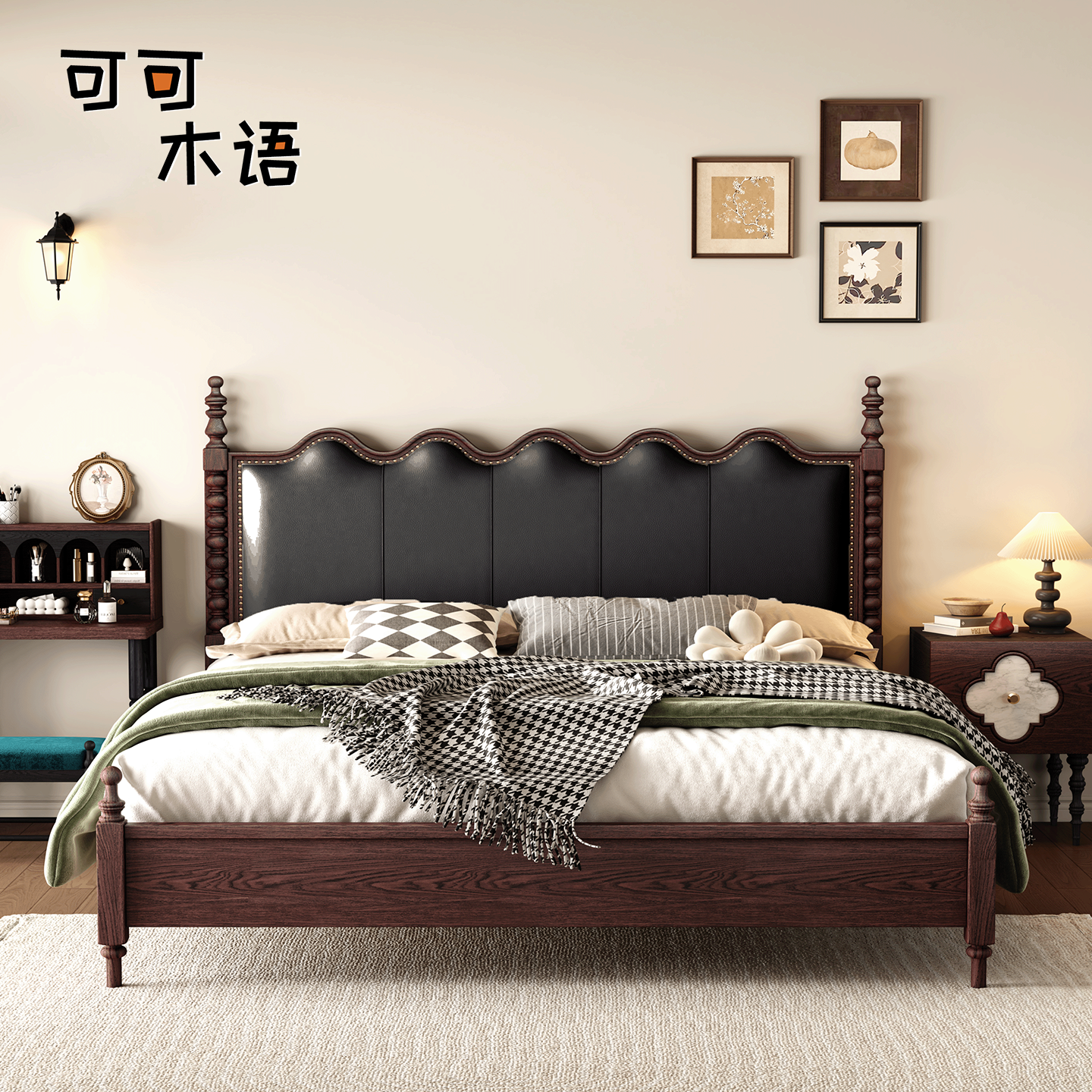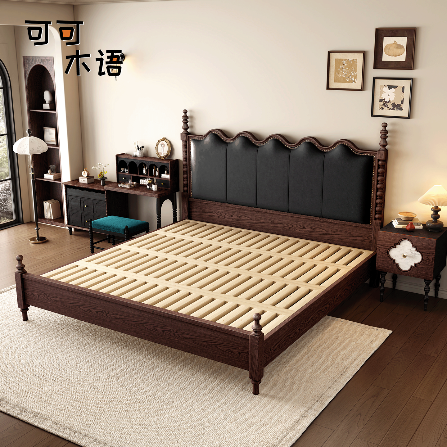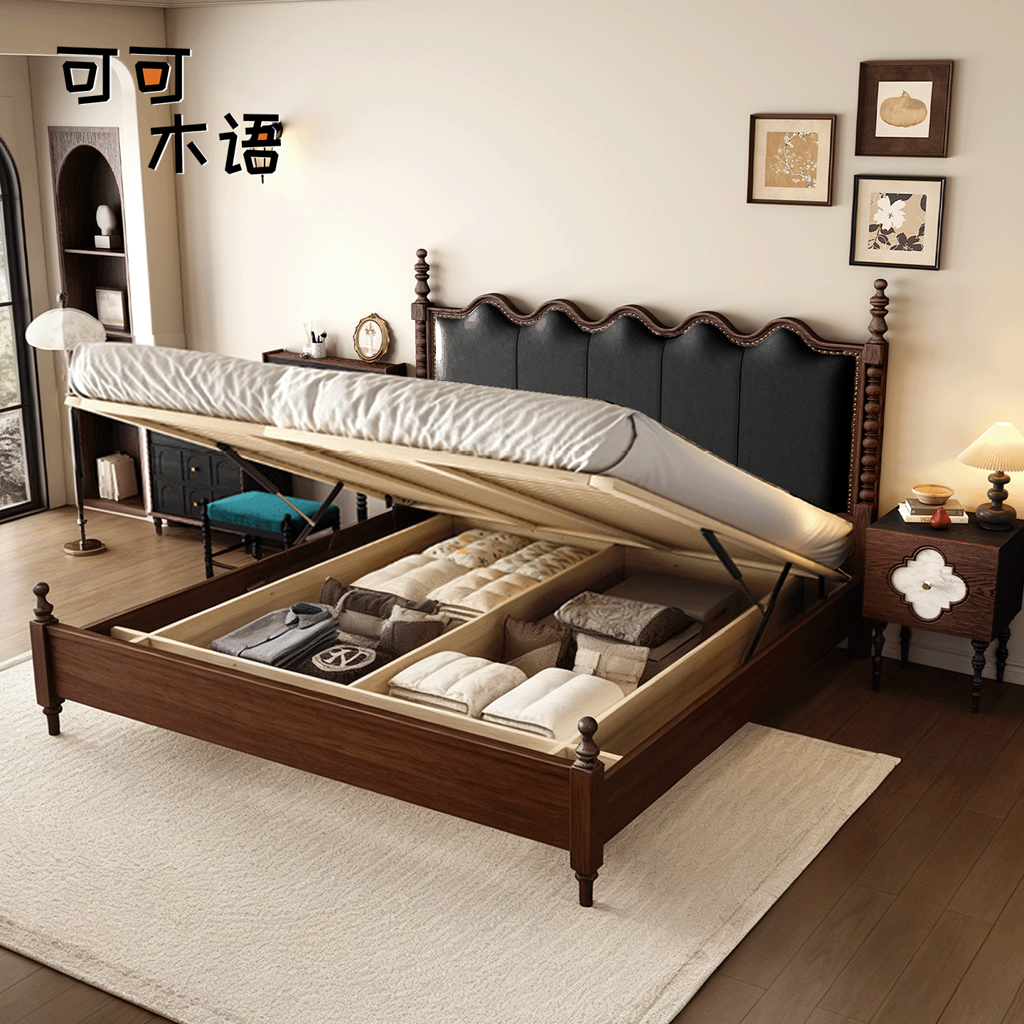 法式复古塞纳床实木软包床美式轻奢双人主卧室涟漪床中古风储物床