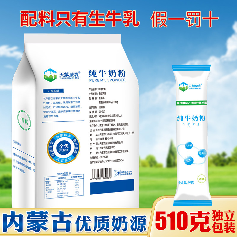 内蒙古国产老式纯牛奶粉510g独立小包装无蔗糖儿童中老年袋装高钙