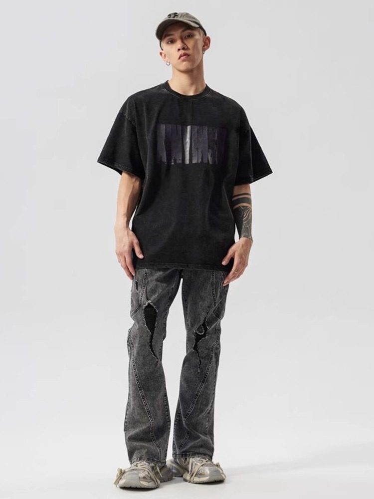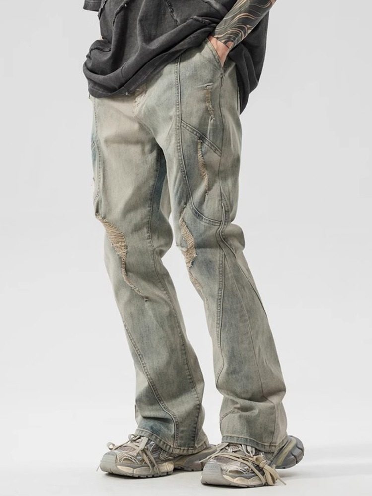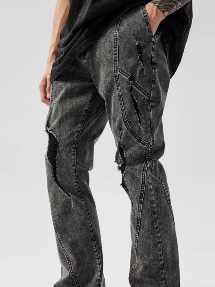 新因素复古牛仔裤做旧折条网纱破洞线条分割设计宽松直筒裤子男款