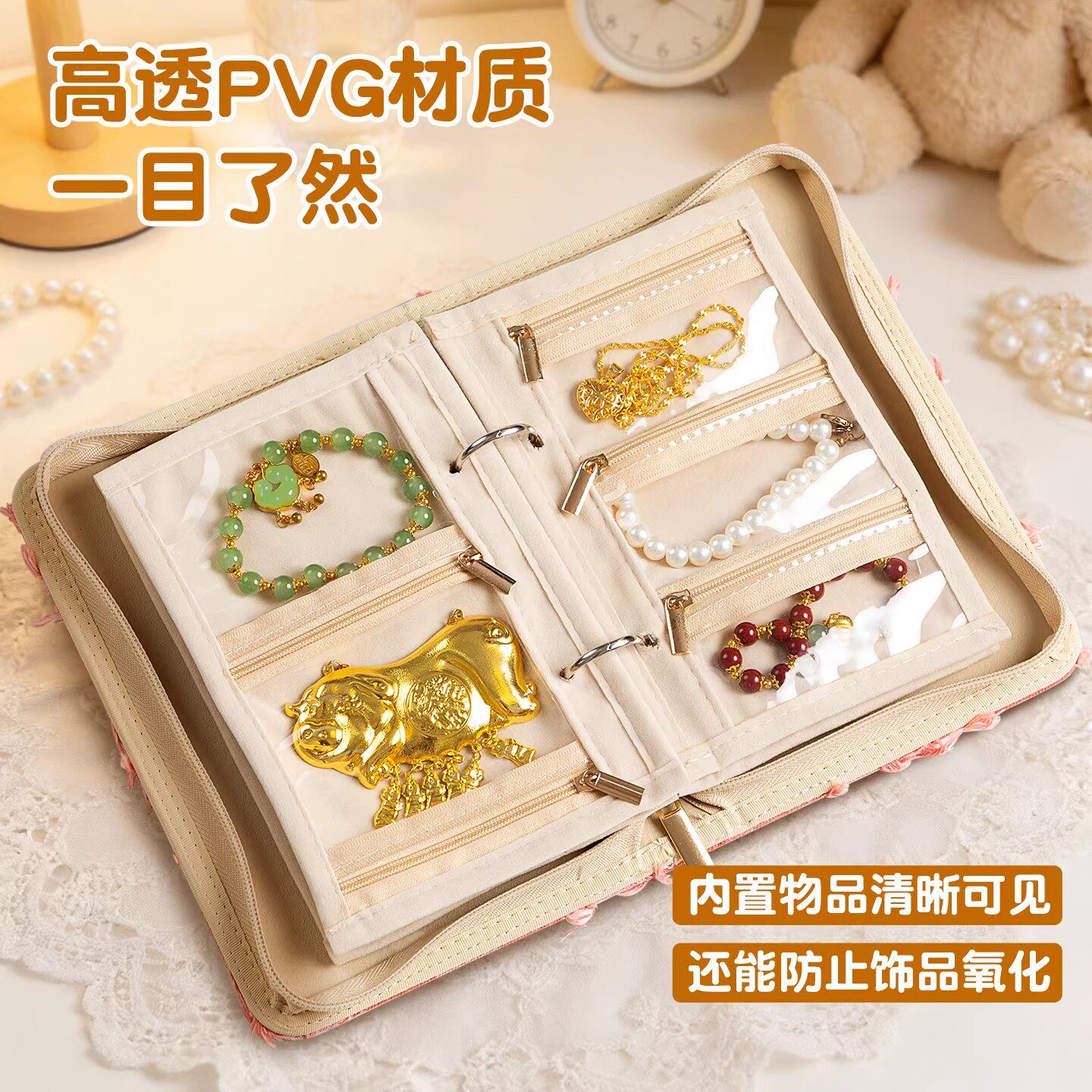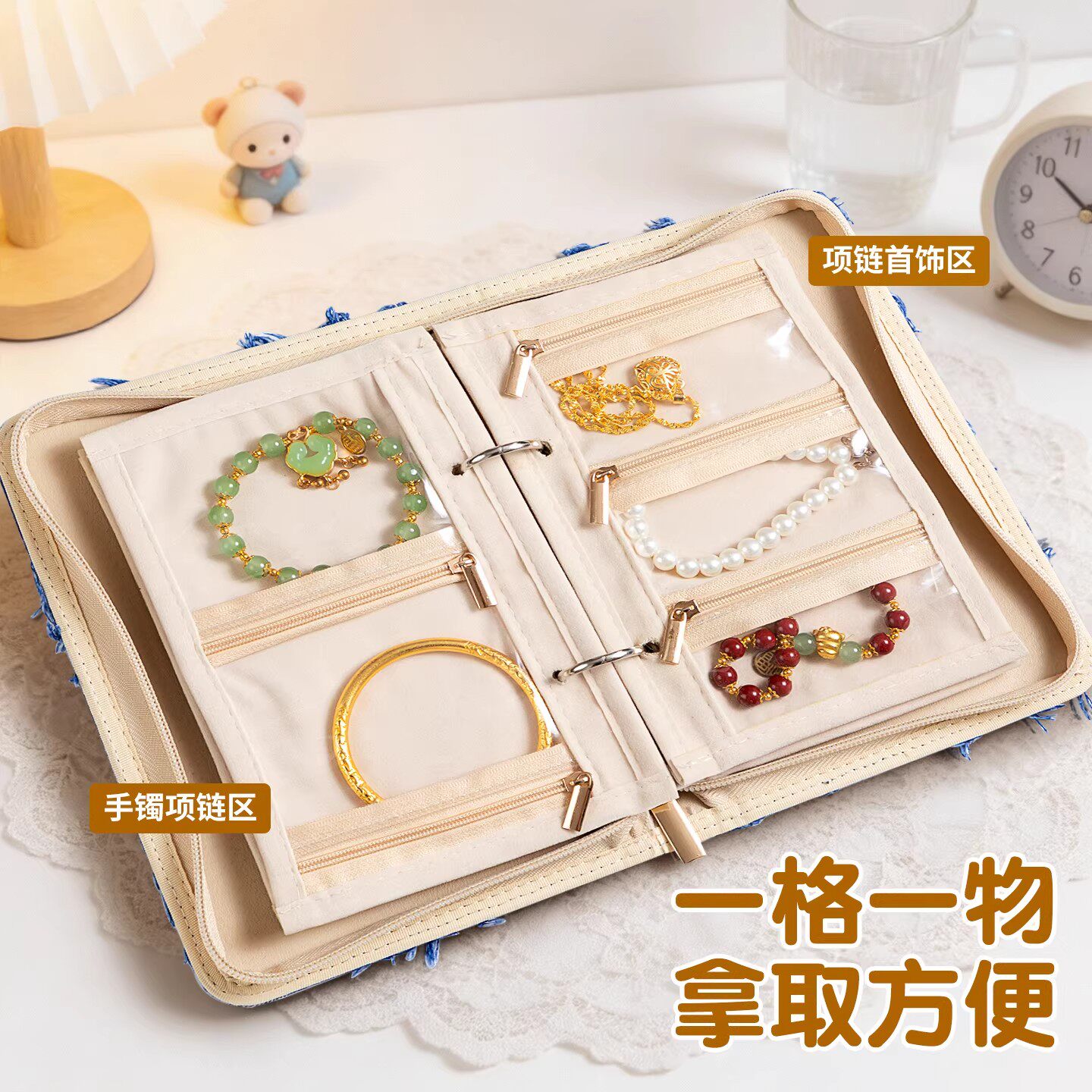 高档首饰收纳册拉链布艺材质多功能牛仔纹首饰收纳包出行旅行便携多层防尘防氧化项链戒指手镯黄金首饰收纳包