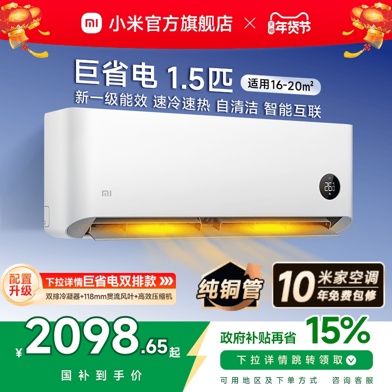 小米巨省电空调挂机冷暖两用1.5匹1匹一级能效变频家用智能壁挂式