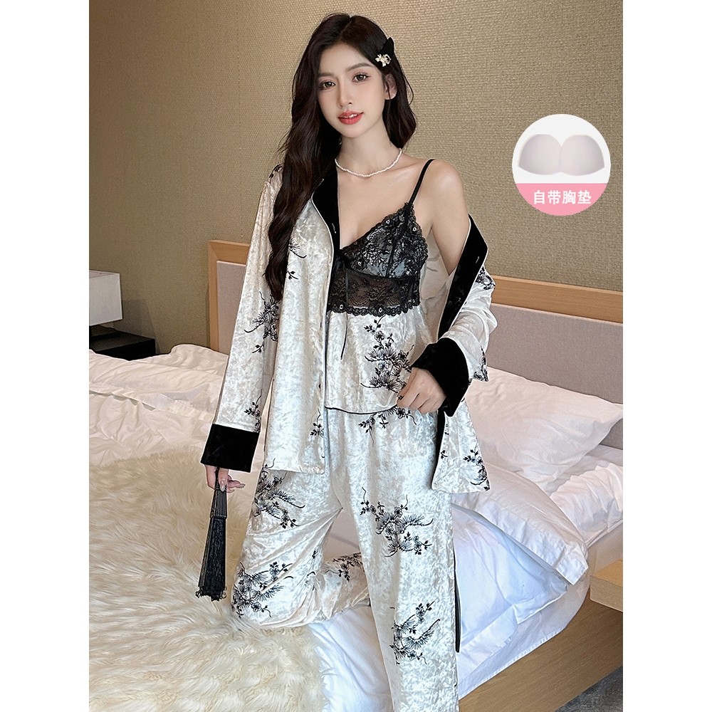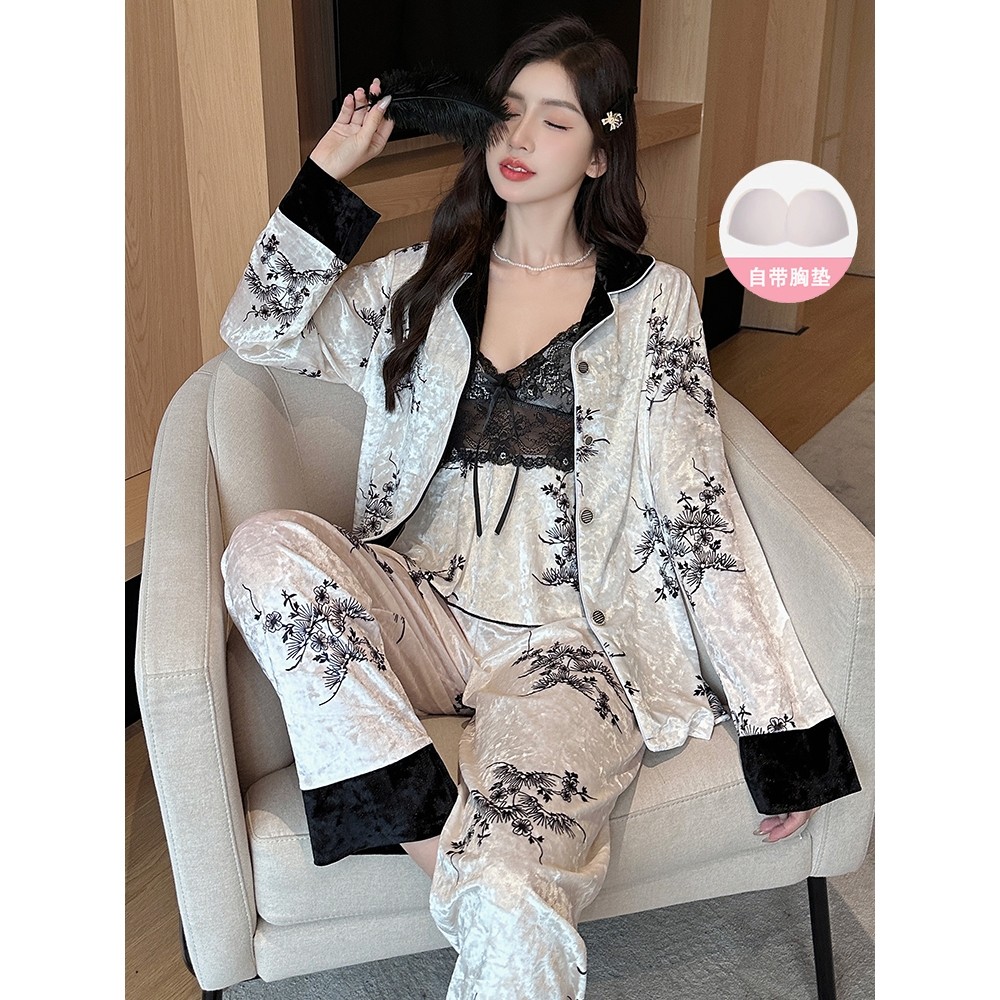 红豆金丝绒睡衣女春秋三件套带胸垫性感吊带长袖长裤轻奢家居服冬