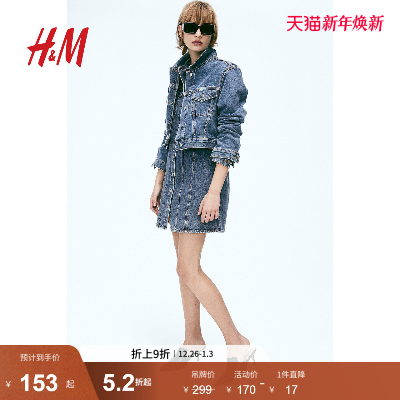 HM女装连衣裙春季休闲风翻领牛仔A字修身长袖短裙1215380