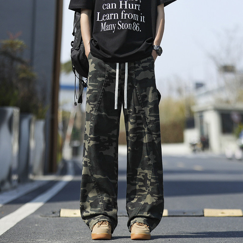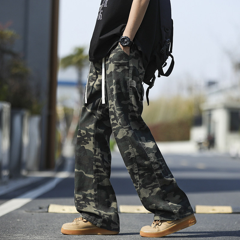 回力美式高街工装迷彩牛仔裤男士春秋季宽松直筒男生水洗休闲长裤