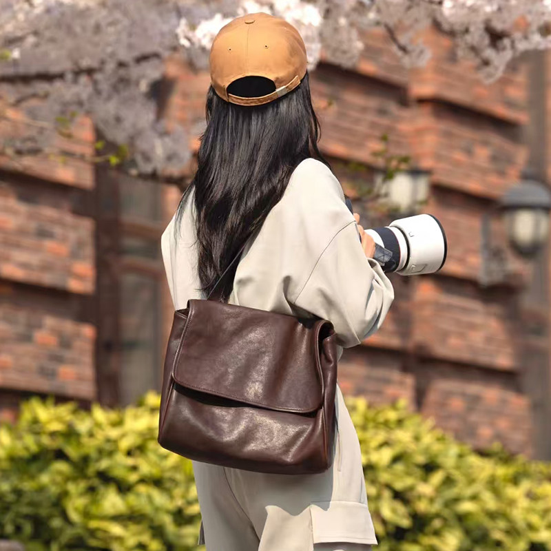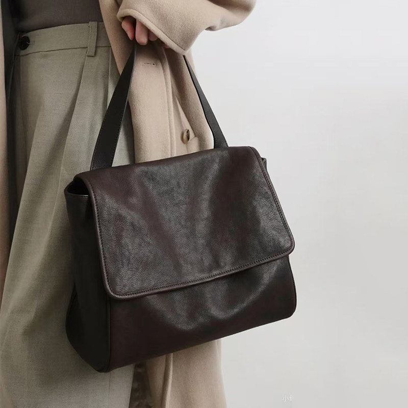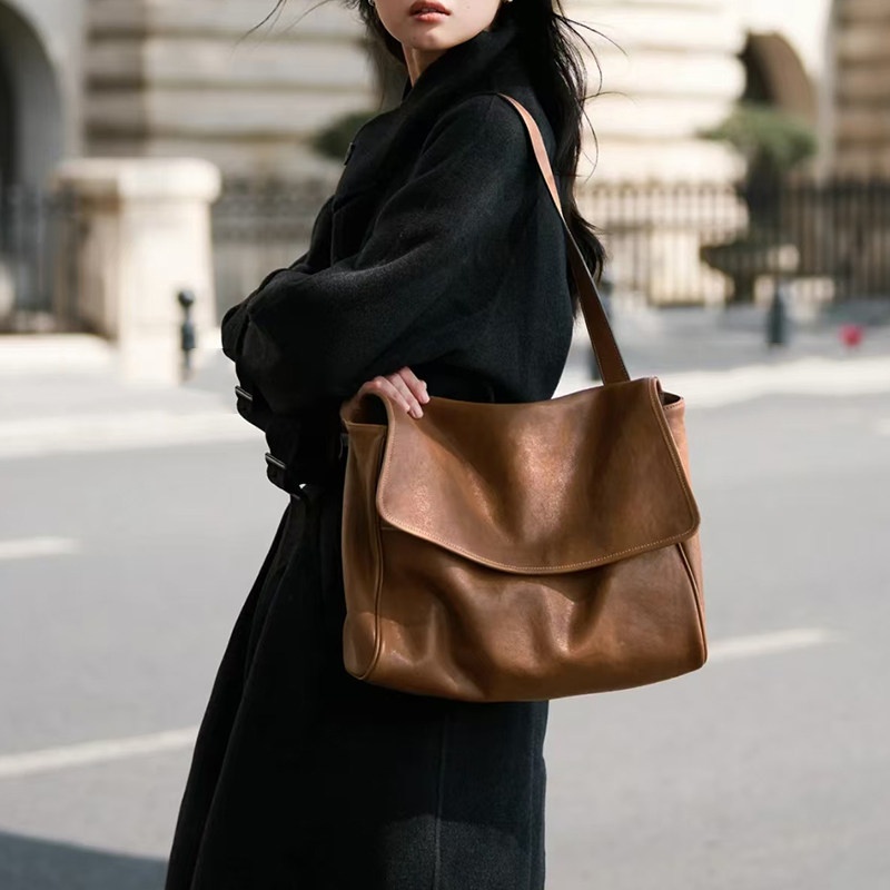 百搭高级感通勤真皮大包大容量邮差包单肩包手提包牛皮翻盖黑色