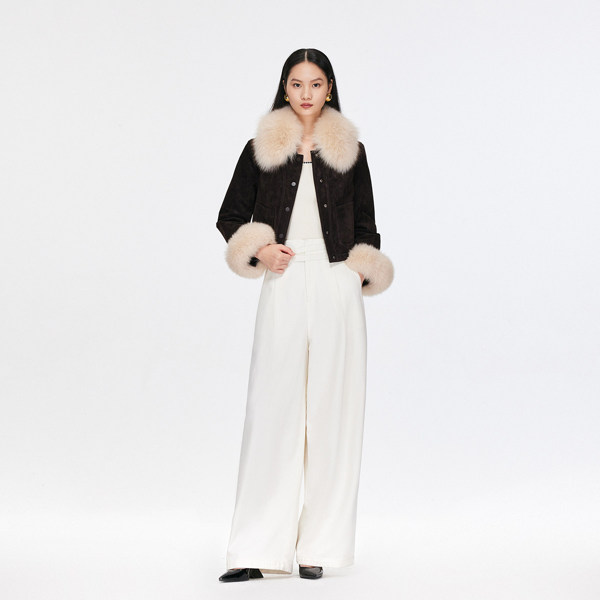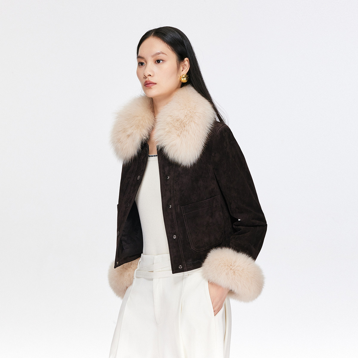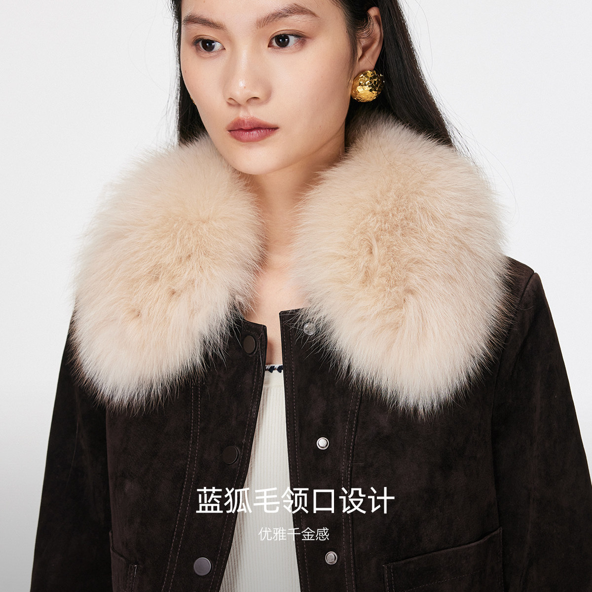 短款真皮复古夹克,狐狸毛领口,优雅千金感