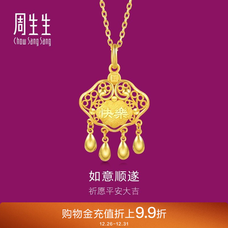 周生生健康快乐金锁长命锁足金小金珠黄金吊坠金饰91005P